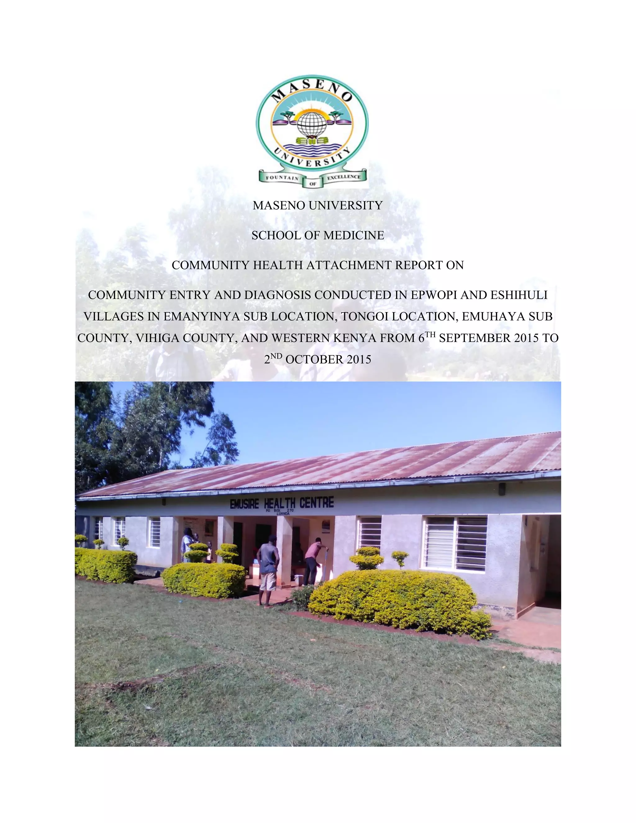The document is a community health attachment report from Maseno University detailing a study conducted in Eshihuli and Epwopi villages in Kenya. It outlines the research methodology, community demographics, health-seeking behaviors, awareness of HIV/AIDS, nutrition practices, and common health problems observed during the data collection from September to October 2015. The findings suggest a need for greater education on health topics and improvements in community health services.