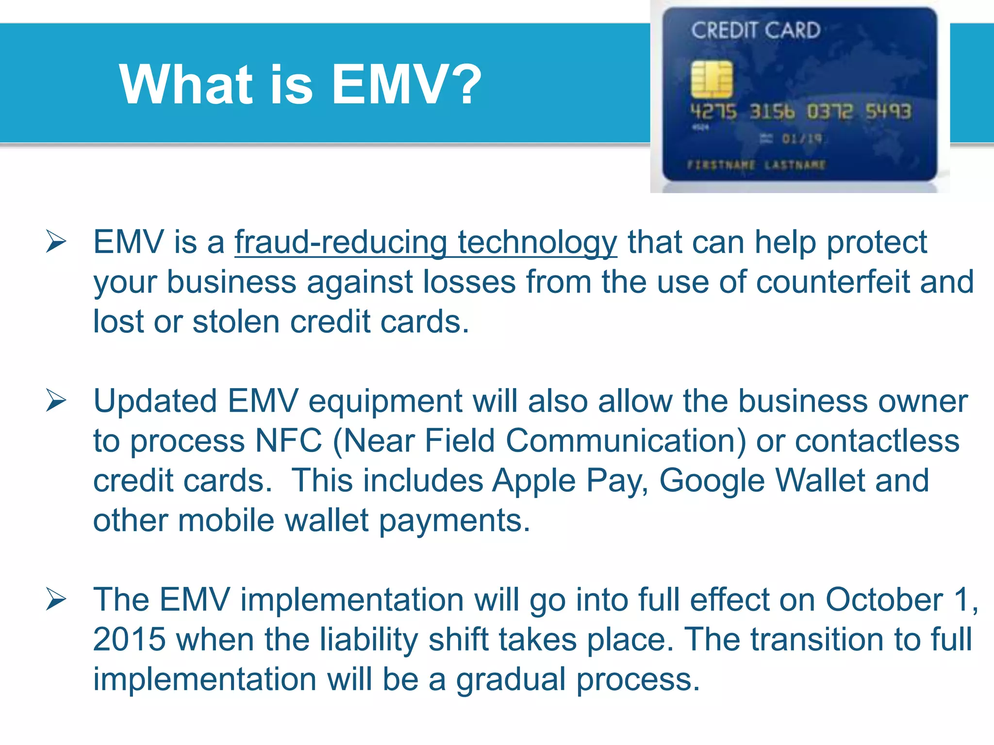 The document discusses the implementation of EMV technology to reduce fraud from counterfeit and lost or stolen credit cards, which requires merchants to upgrade their point-of-sale equipment by October 1, 2015. EMV cards contain a microprocessor that enhances security through dynamic data, and the transition to EMV in the U.S. faces delays due to infrastructure and costs. Additionally, it emphasizes the importance of PCI compliance and offers strategies for businesses to prepare for the shift to EMV, including encryption and tokenization to protect payment data.