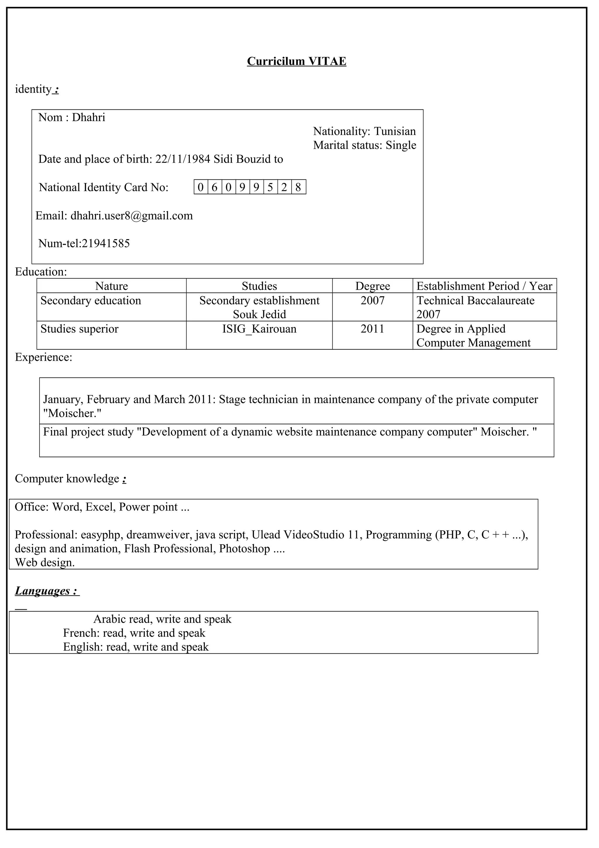 This document is a curriculum vitae for an individual named Dhahri who is Tunisian and single. It outlines their education history which includes a technical baccalaureate degree from a secondary school in 2007 and an applied computer management degree from ISIG_Kairouan in 2011. It also lists work experience doing an internship in 2011 at a private computer maintenance company where they developed a dynamic website. Finally, it outlines computer skills and languages including Arabic, French, and English.