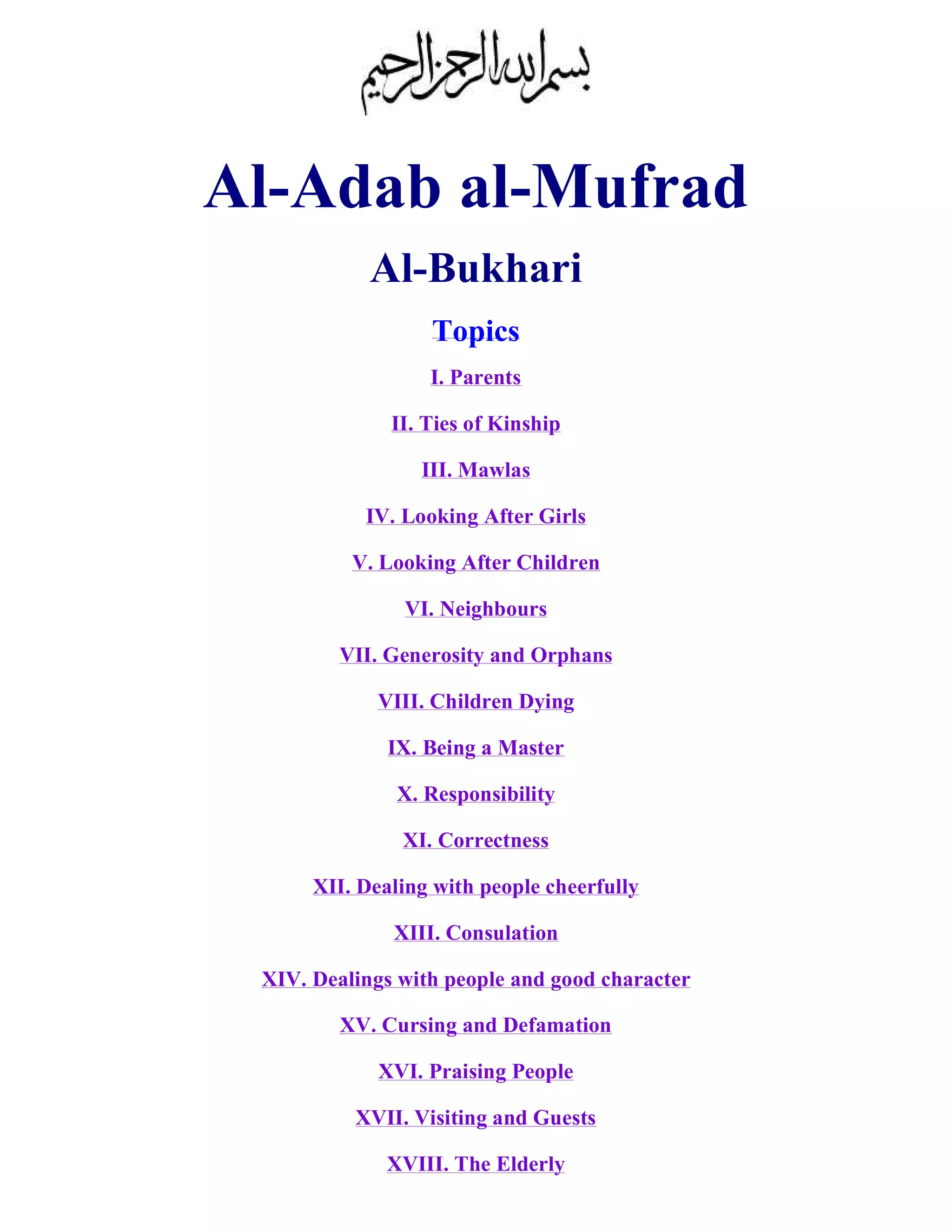 This document outlines chapters from the book "Al-Adab al-Mufrad" by Al-Bukhari on various topics related to social behavior and manners. The chapters covered include duties towards parents, kinship ties, generosity, visiting the sick, good character, speech, and more. Specific hadith are cited emphasizing the importance of honoring and being dutiful towards one's parents, even if they wrong you, as long as it does not involve disobeying Allah. Gentle speech and repaying parents for raising you are also encouraged.
