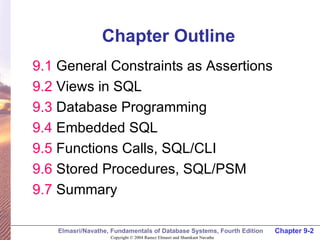 This document summarizes the key topics covered in Chapter 9 of a SQL textbook, including assertions to specify general constraints, views which allow querying of virtual tables, various techniques for database programming using embedded SQL, Java Database Connectivity (JDBC), and stored procedures.