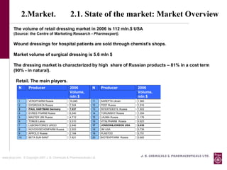 The wound dressing market in Russia is underdeveloped with high market share held by Russian products. Modern wound dressings have low usage due to high costs, doctors' preference for traditional treatments, and lack of promotion from major manufacturers. The document proposes marketing Algidex wound dressings by increasing awareness among doctors and patients, and entering tender markets to develop the market's potential which is estimated at $10 million annually.