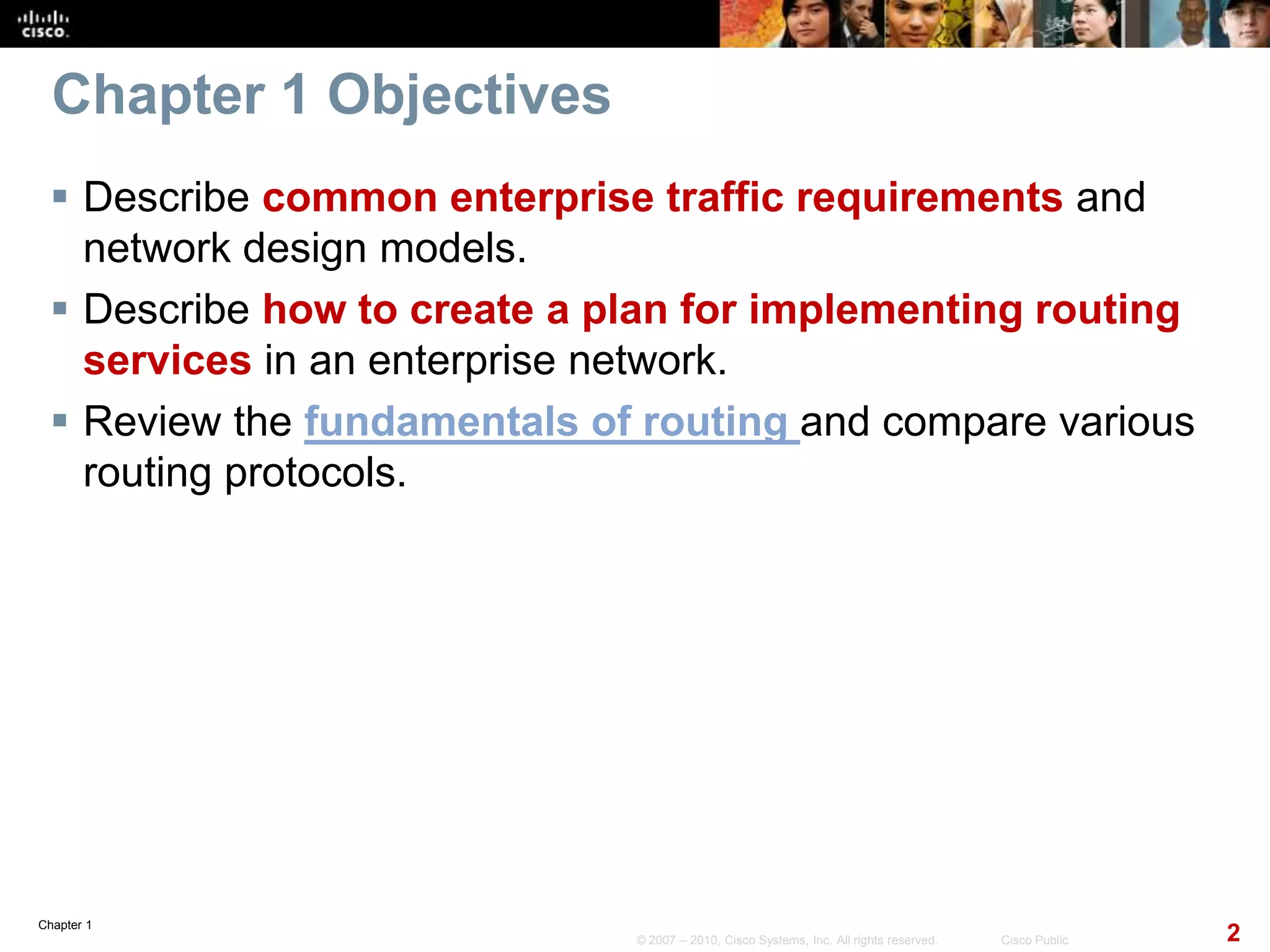 This chapter discusses routing services in enterprise networks. It describes common enterprise traffic requirements including voice, video, and data. It also discusses frameworks for network design, including Cisco's Intelligent Information Network (IIN) and Service-Oriented Network Architecture (SONA). The chapter reviews models for network design including hierarchical and composite models, and explains how to create an implementation plan with tasks, documentation, and verification steps.