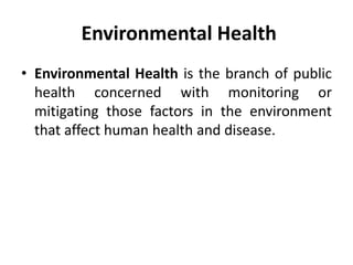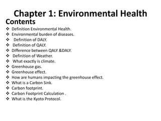 This document provides definitions and explanations of key concepts related to environmental health and climate change. It defines environmental health, disability-adjusted life years (DALYs), quality-adjusted life years (QALYs), and the difference between the two. It also explains weather, climate, greenhouse gases, the greenhouse effect, how humans are impacting it, carbon sinks, carbon footprints, and the Kyoto Protocol.