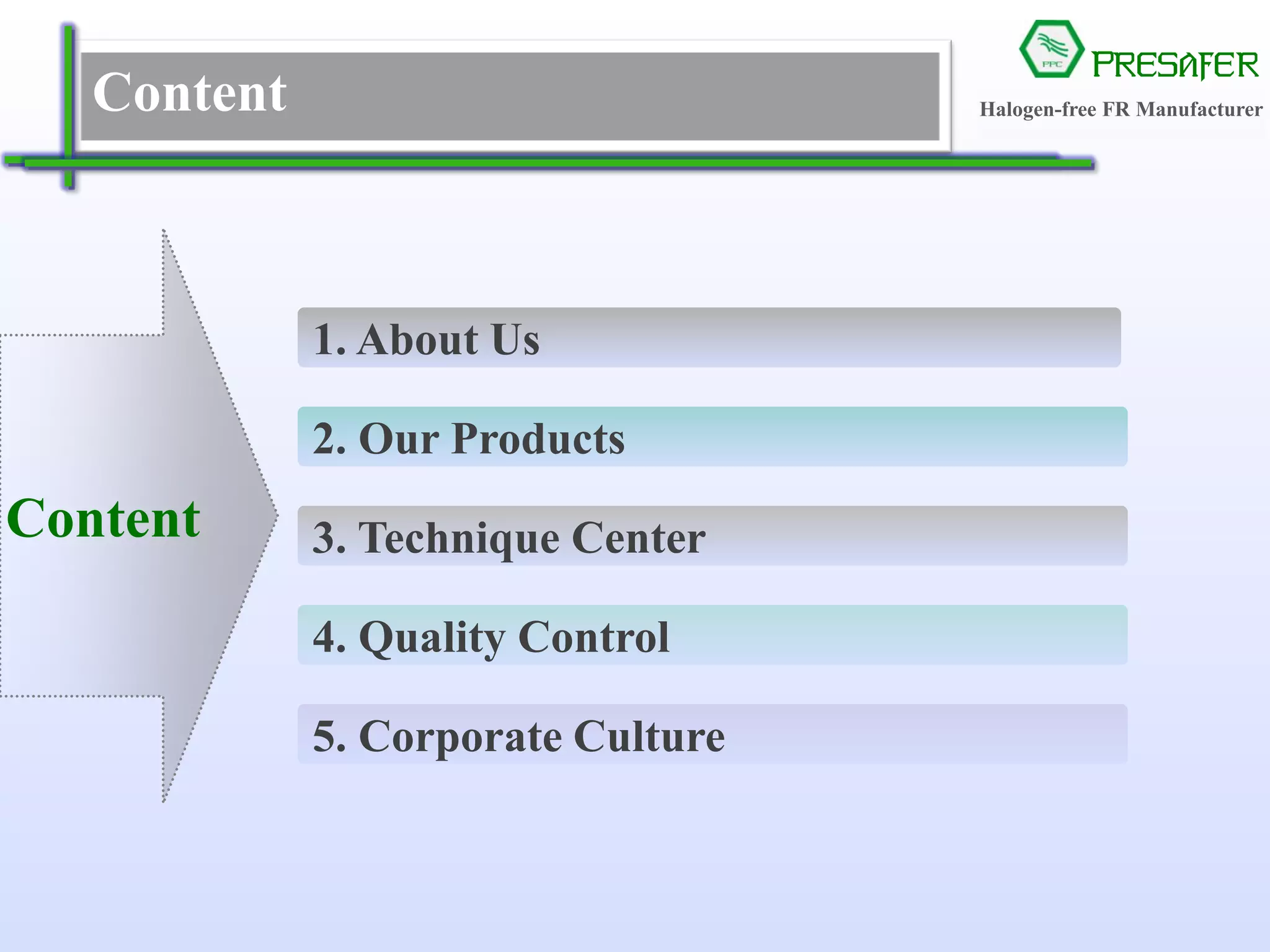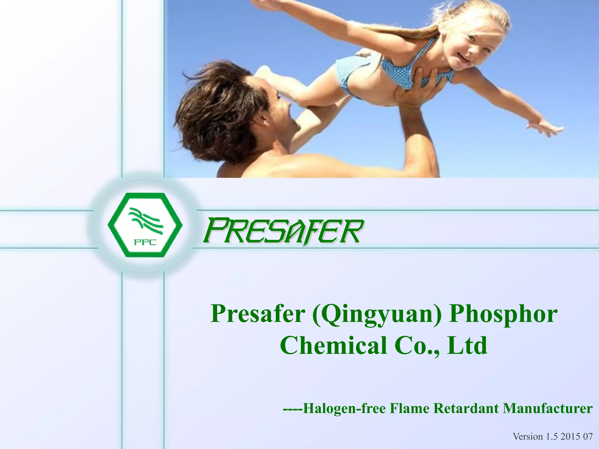 Presafer is a Chinese manufacturer of halogen-free flame retardants established in 2007. It has over 120 employees and covers an area of 34,000 square meters. Presafer researches, produces, and distributes environmentally friendly flame retardants for applications in textiles, transportation, electronics, and construction. It has an R&D center, pilot plant, testing laboratory, and application support laboratory to develop and test new products. Presafer aims to be a global leader in environmentally friendly chemical products through innovation and technology.