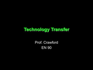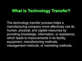 Technology transfer involves the sharing of knowledge, information, or assistance between organizations to help improve processes, equipment, methods, or marketing. It includes the progression from invention to innovation to design and finally diffusion or marketing of new technologies. There are many factors that influence how long it takes an invention to reach the market, including the need for further innovation, design improvements, feedback from potential users, and promotion of the new technology. Effective technology transfer relies on the flow of various types of information between parties.