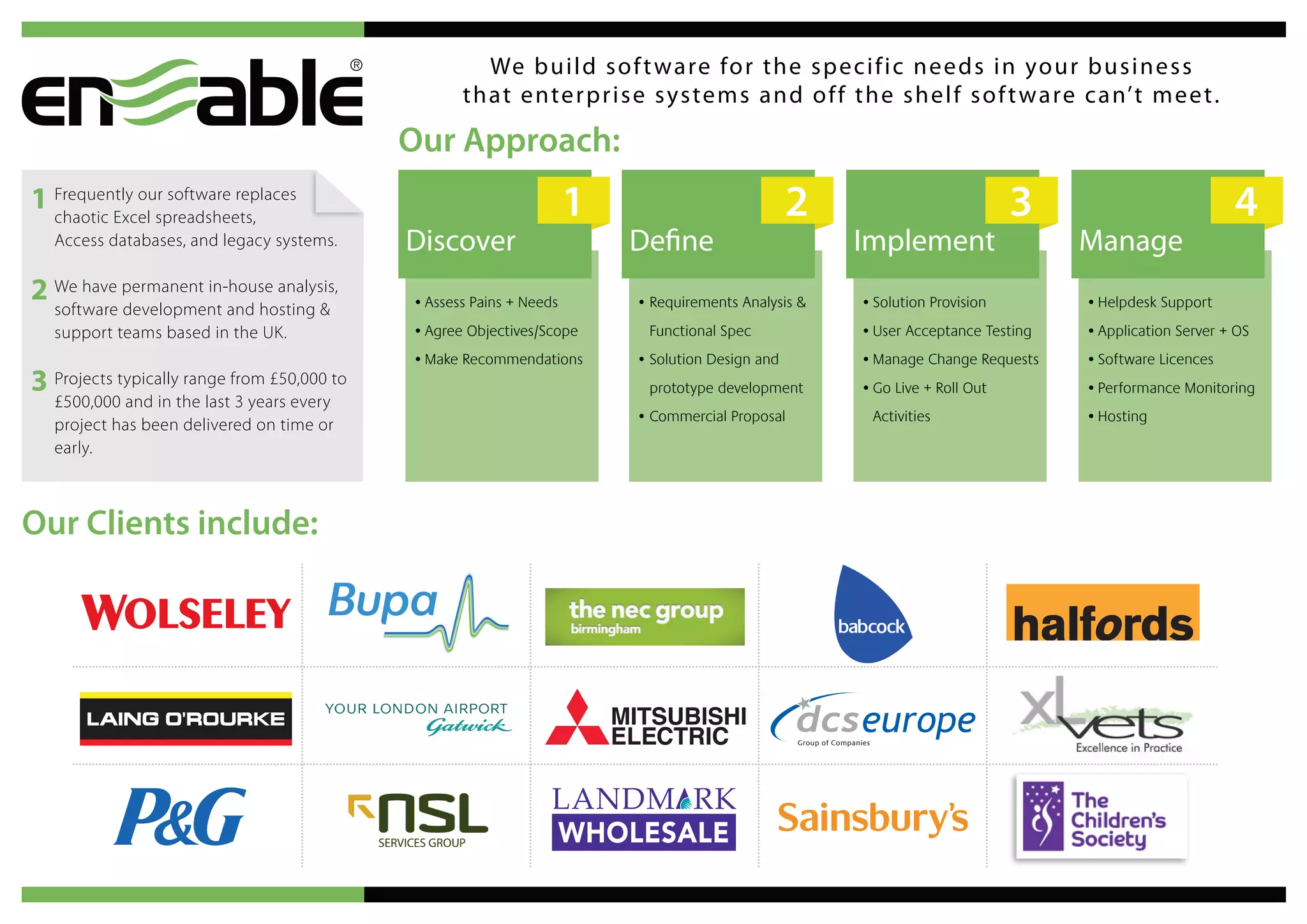 We build customized software solutions to meet the specific needs of businesses that enterprise systems and off-the-shelf software cannot address. Our in-house teams develop, implement, and support software projects ranging from £50,000 to £500,000, and we have delivered every project on time or early in the last 3 years. We help clients across various industries with solutions like rebate management, stock control, financial reporting, and more.