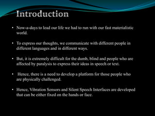 This document describes a device that helps people with disabilities communicate. It includes gloves with flex sensors that allow people with paralysis to convey words by finger movements. It also has speech-to-text and text-to-speech functions to help deaf and blind users. The device translates sign language, finger movements, or whispered speech into audible words using sensors, microcontrollers, and Bluetooth. This allows people with disabilities to express their basic needs and thoughts without needing a human interpreter.