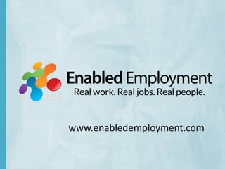 The document highlights Jessica May, founder and CEO of Enabled Employment, and discusses the various types of disabilities in Australia, including their prevalence and the stereotype of individuals with disabilities being less capable. It also notes the benefits for employers who hire people with disabilities, such as loyalty and lower claims. Contact information and resources for Enabled Employment are provided.