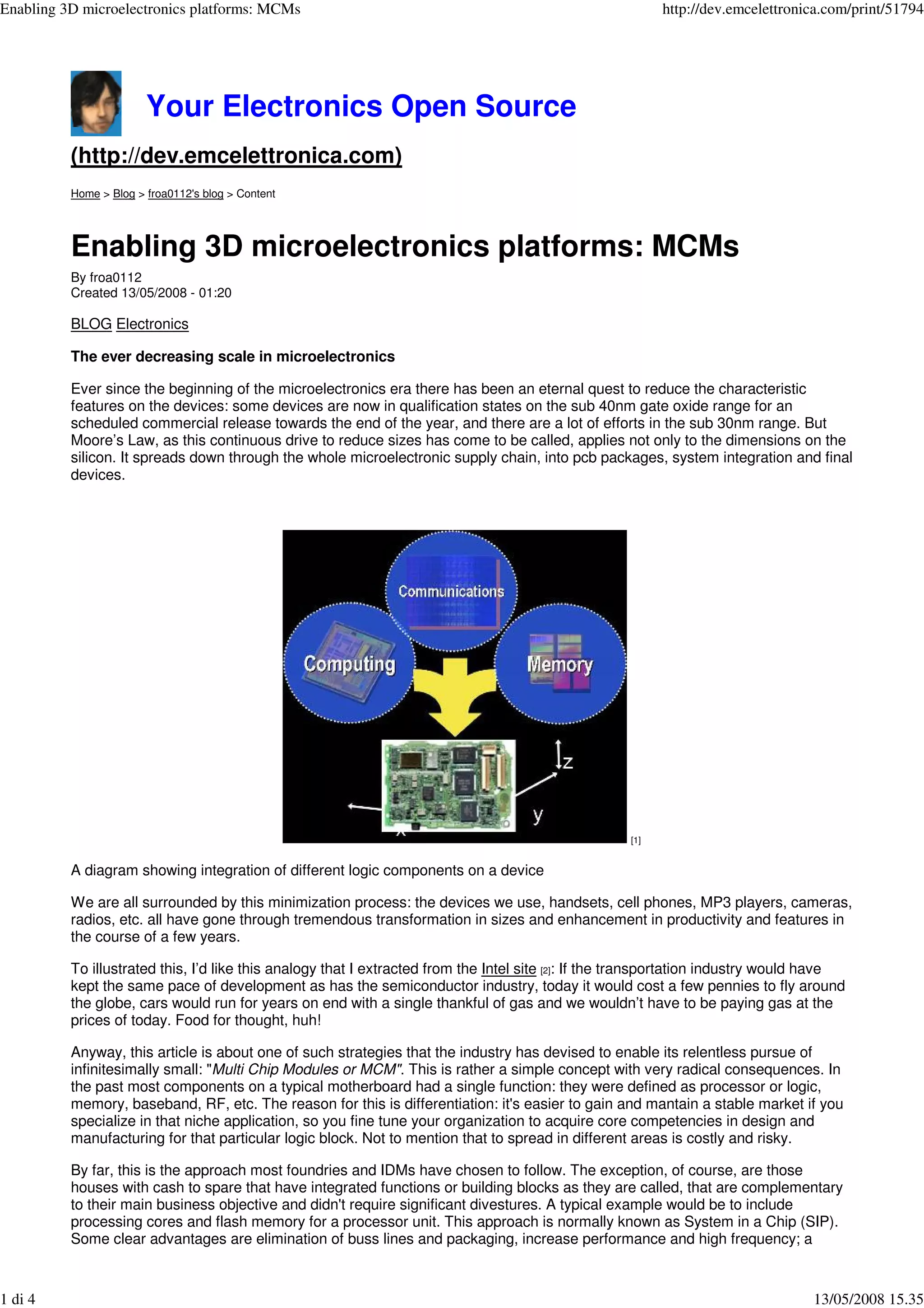 The document discusses advancements in 3D microelectronics platforms, particularly focusing on Multi-Chip Modules (MCMs) which combine different functions into a single device, thus optimizing space and costs. MCMs provide significant advantages, including improved performance, rapid design, and reduced development costs, making them suitable for competitive markets like smartphones and portable computers. The widespread adoption of MCM technology is transforming the microelectronics industry by allowing design houses to outsource manufacturing while maximizing market opportunities.