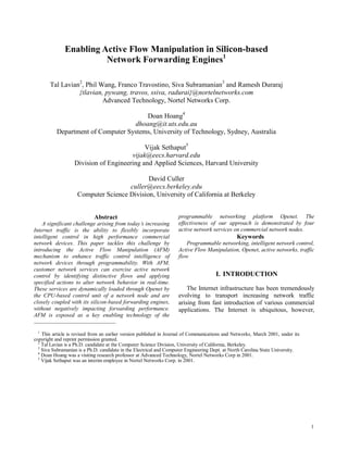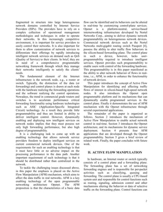 The document introduces active flow manipulation (afm) as a mechanism to enhance traffic control intelligence in silicon-based network devices through programmability, enabling real-time alterations of network behavior. This approach is integrated within the openet platform, which allows service providers to dynamically load intelligent network services without negatively impacting forwarding performance. The paper discusses the architecture of openet, the functionalities of the afm mechanism, and demonstrates its effectiveness through various applications on commercial network nodes.