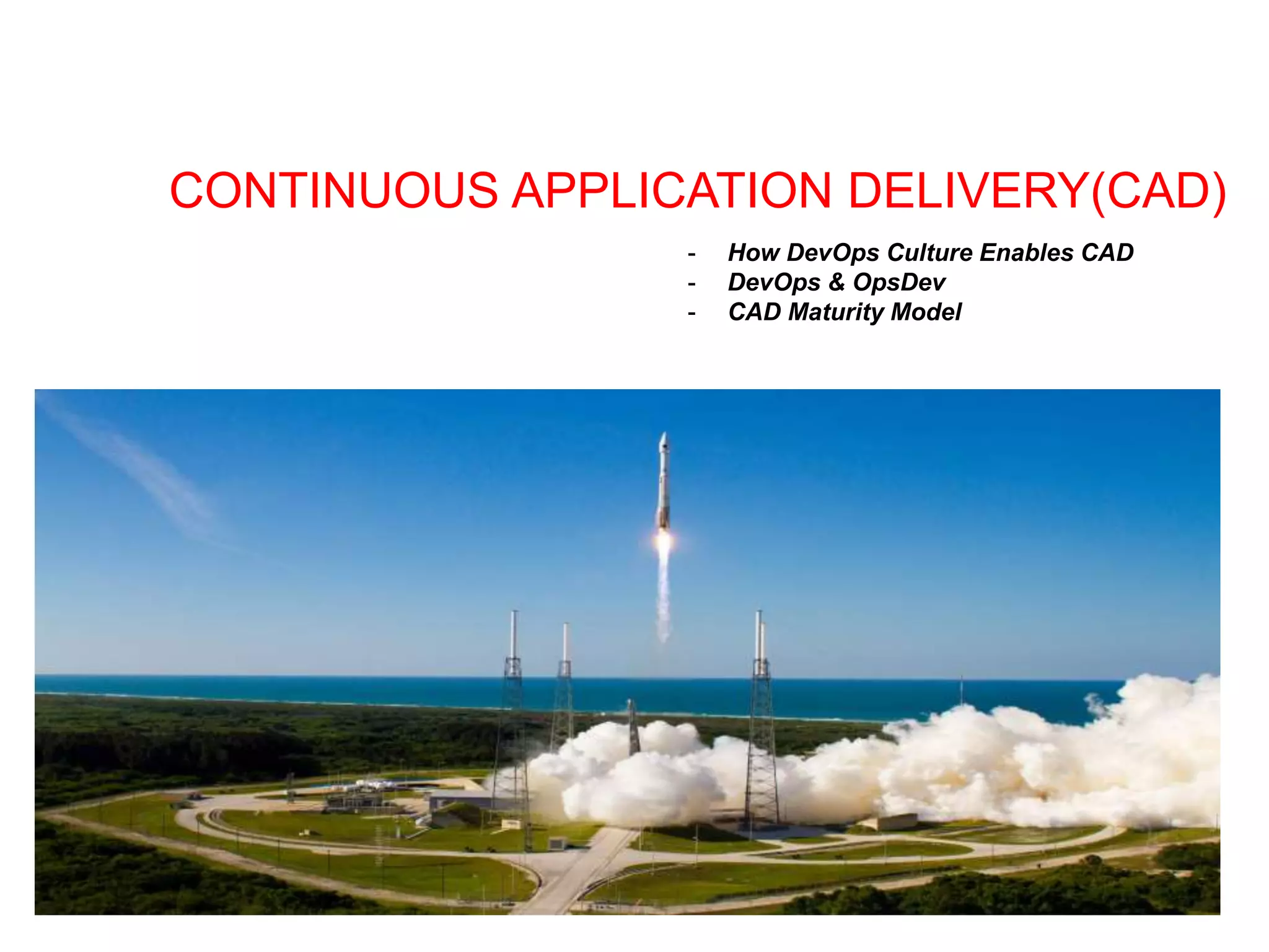 The document discusses continuous application delivery (CAD) and how DevOps principles enable it. It describes breaking down silos, automating processes, and collaborating as a unified team. The CAD maturity model scores organizations on agile delivery practices like continuous integration, automated testing, and self-service tools. Highly mature organizations implement patterns like trunk-based development, automated testing and deployment, and decoupling database changes.
