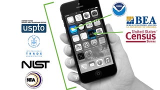 The document discusses enabling data-driven collaborations between public and private sectors, highlighting initiatives by the US Department of Commerce under Dr. Tyrone Grandison. It outlines various data projects and tutorials aimed at utilizing vast datasets for economic growth and public engagement. Key areas of focus include data usability, understanding weather risks, and cyber vulnerability patterns, with an emphasis on open access to data and collaboration.