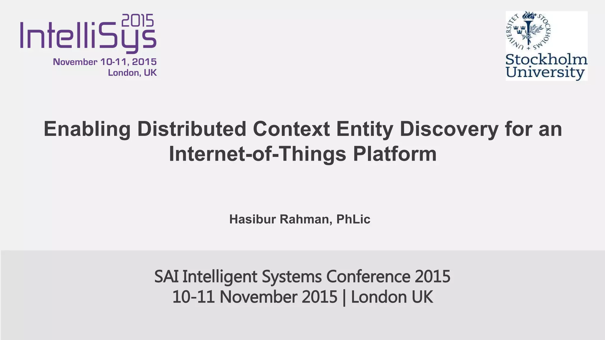 The document proposes a solution to enable context entity discovery in an Internet of Things (IoT) platform. It introduces a publish/subscribe approach using a rendezvous node as an initial publisher of a global Universal Context Identifier (UCI). Entities subscribe to this by default. Two new messages, joinUCI and DISCOVER, are added to the Distributed Context eXchange Protocol (DCXP) to allow entities to join and discover existing UCIs. Evaluation shows the extended DCXP achieves context entity discovery on par with the original protocol but can scale to larger networks.