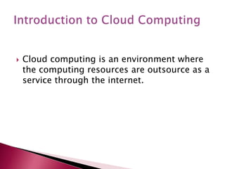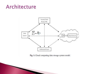 Cloud computing is an environment where computing resources are provided as internet-based services. There are three main types of cloud services: Infrastructure as a Service (IaaS), Platform as a Service (PaaS), and Software as a Service (SaaS). Traditional access control techniques assume data owners and storage servers are in the same trusted domain, but this is no longer true when data is outsourced to a remote cloud service provider outside the trusted domain. Cloud service providers need safeguards against dishonest data owners.