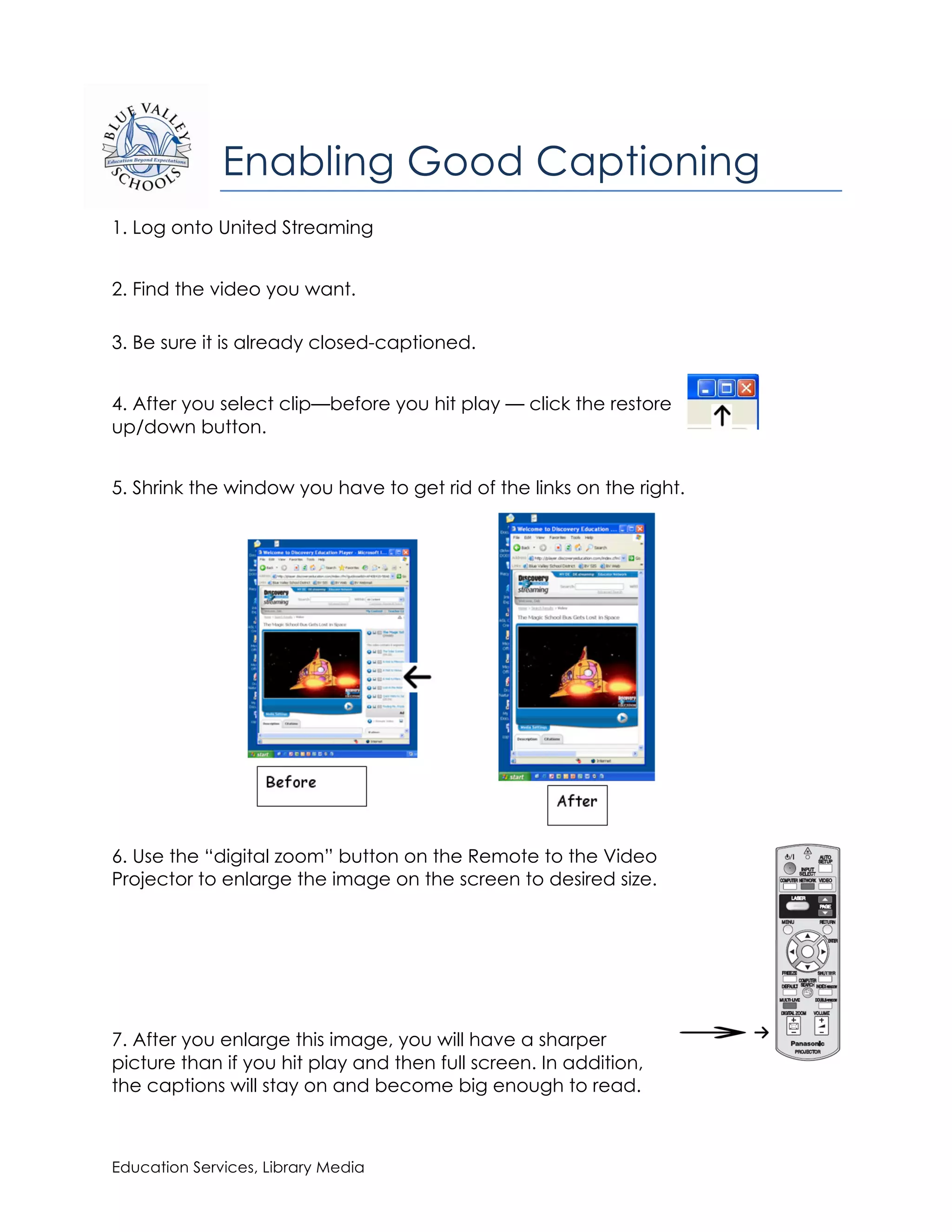 To enable good captioning when playing a video from United Streaming: select a closed-captioned video, click the restore button before playing, shrink the window and use the projector's digital zoom button to enlarge the video and captions on the screen before hitting play for a sharper picture and readable captions.