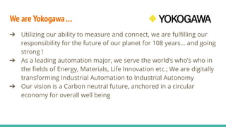 The document outlines Yokogawa's approach to enabling low/no code engineering for information modeling in industrial automation, emphasizing the transition from traditional automation to digital autonomy. It highlights challenges faced by customers in merging operational technology and IT, advocating for intuitive model building and sharing among engineers. Additionally, it explores the integration of various data sources and the use of graph technology to improve the efficiency of model usage and retrieval.