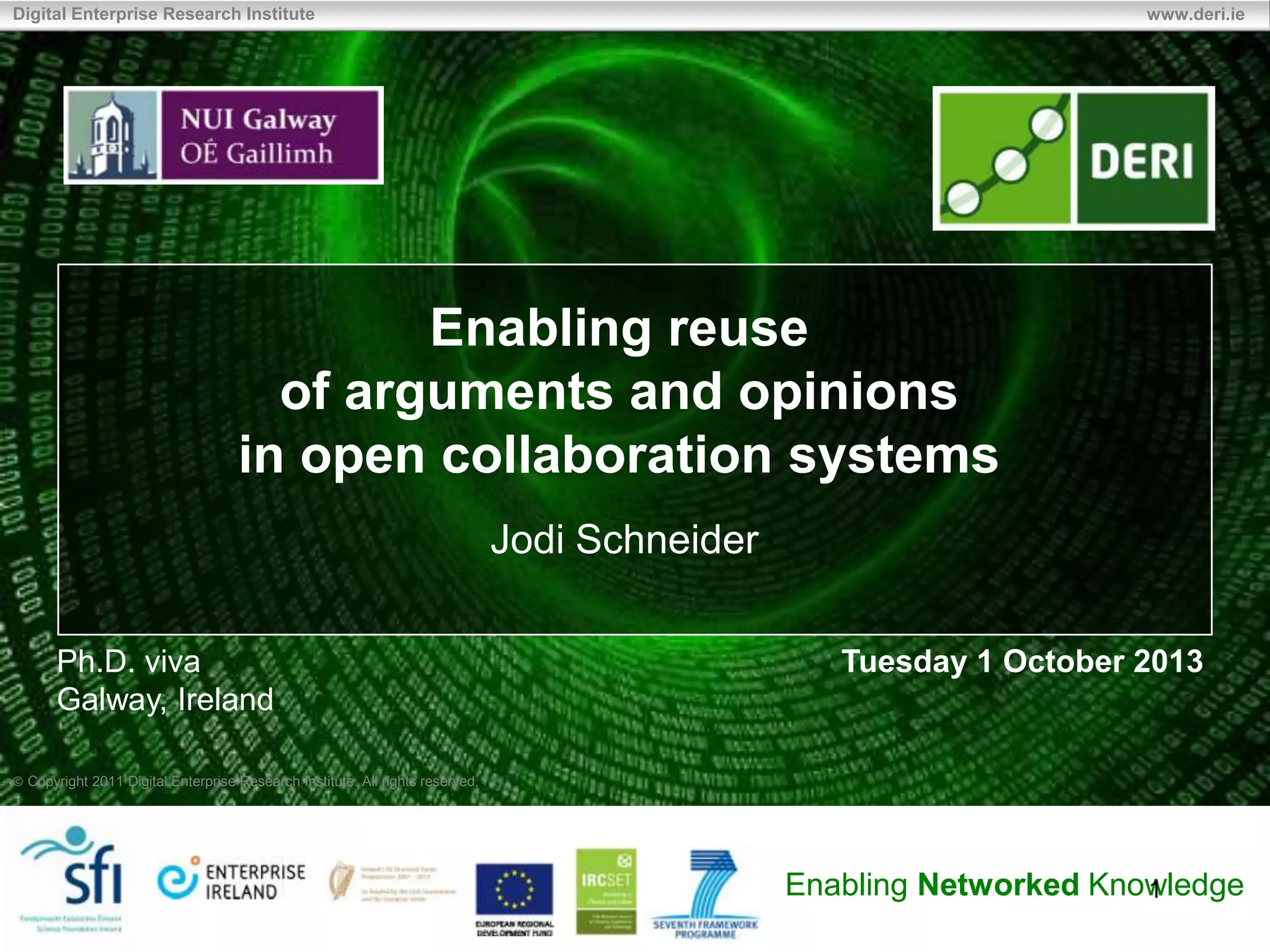 This document summarizes a PhD thesis on enabling the reuse of arguments and opinions in open collaboration systems. It discusses three research questions: 1) opportunities and requirements for argumentation support, 2) common arguments used in these systems, and 3) structuring arguments to support reuse. The methodology involved analyzing discussions from Wikipedia and open collaboration projects using argumentation theories like Walton's schemes and factors analysis. The goal is to develop semantic structures and visualizations to help people understand diverse opinions and make collaborative decisions. A prototype system tested with users found structuring discussions by key factors helped people evaluate arguments more effectively.