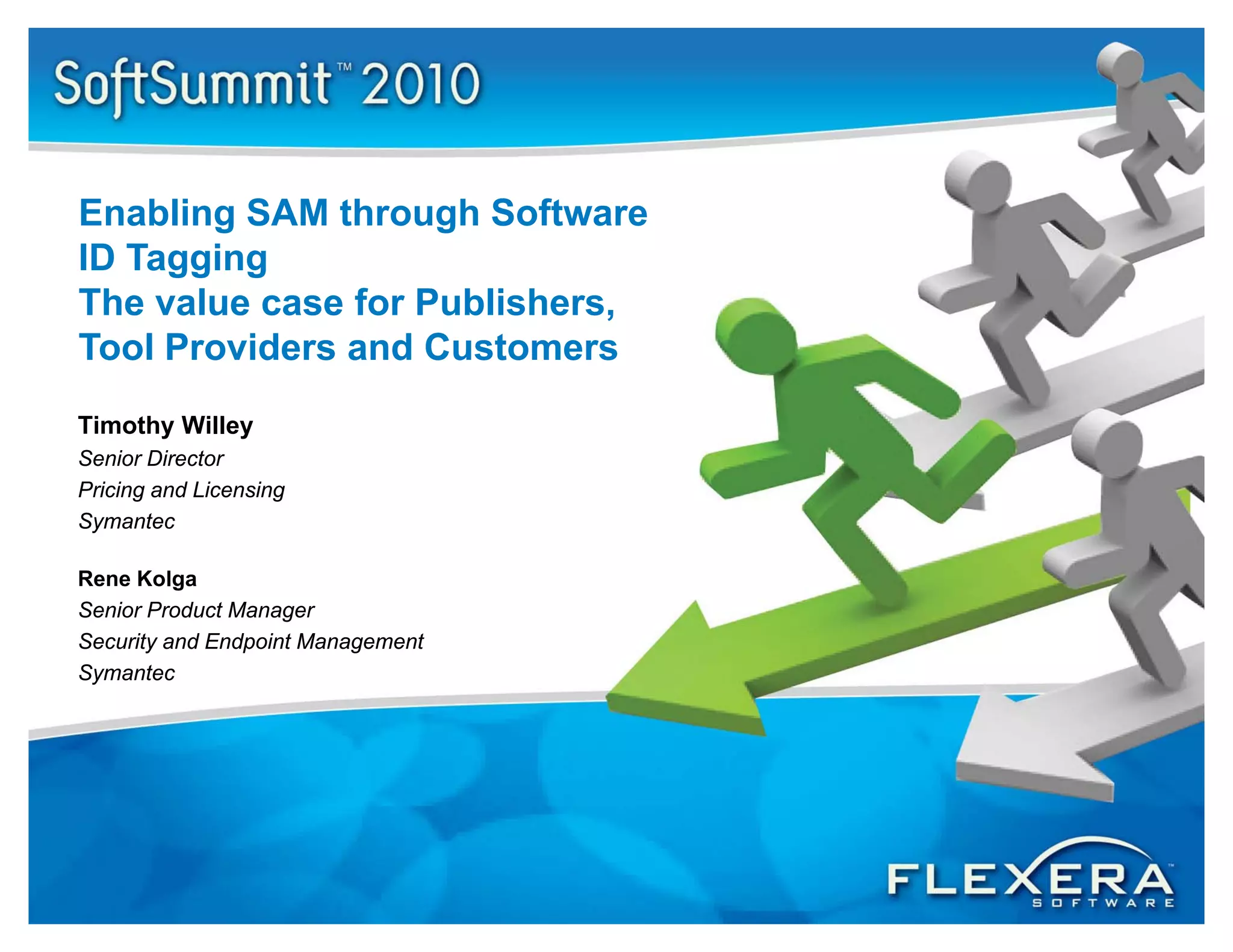The document discusses the benefits of implementing software identification tags (SWID) for software asset management (SAM), emphasizing that these tags simplify inventory management, compliance, and cost efficiency for publishers and customers. It highlights the challenges in managing inventory information and proposes SWID tags as a solution to enable accurate reporting and integration across platforms. Additionally, it notes that government regulations are increasingly requiring the use of such tags to streamline procurement processes and enhance security.