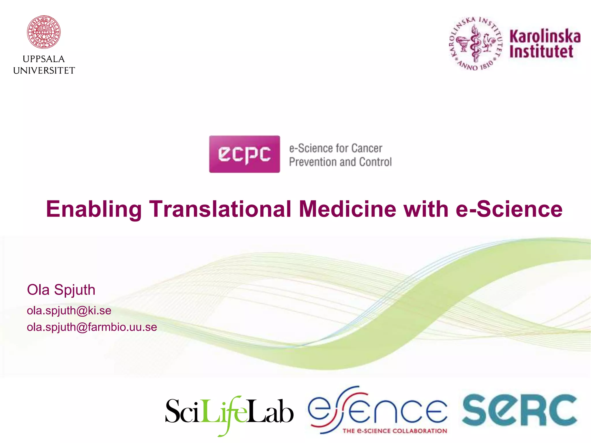 This document discusses how e-science can enable translational medicine and support cancer research. It highlights several projects using e-science approaches: