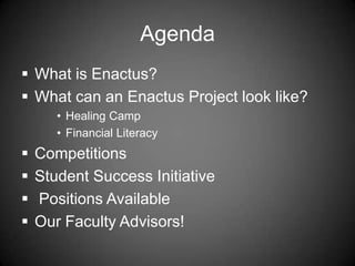 Enactus is a global network of students dedicated to using entrepreneurial action to create social and economic progress, with projects focusing on areas like healing camps and financial literacy. The organization hosts competitions to showcase impactful projects, and offers student success initiatives that provide professional development opportunities and networking. Recruitment is currently open for various leadership and project management positions across multiple initiatives.