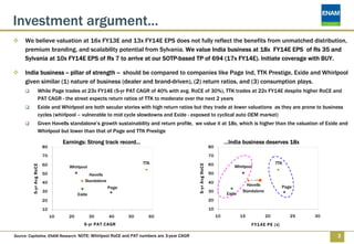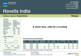 The report recommends buying Havells India with a target price of Rs 694, representing 28% upside potential. Havells has a strong distribution network and brands, and its India business deserves a higher valuation of 18x FY14 EPS compared to its peers due to stable growth and returns. The report also views Havells' Sylvania business positively, though near-term earnings will be muted in Europe; it values Sylvania at 10x FY14 EPS. The report's sum-of-the-parts valuation arrives at a target price of Rs 694 per share.