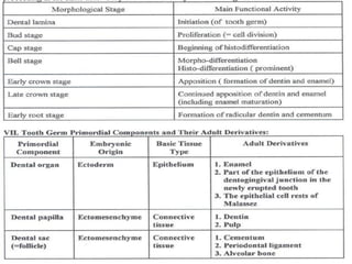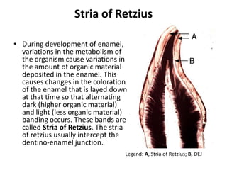 This document provides information about the structure of enamel in teeth. It discusses striations of Retzius, enamel rods, tufts and lamellae. It explains how variations in organic material deposition during development lead to darker and lighter banding in enamel. It also describes structures like the neonatal line, gnarled enamel, Hunter-Schreger bands, cross-striations and enamel spindles. Electron micrographs show enamel features like rods, tufts and the dentinoenamel junction in detail.