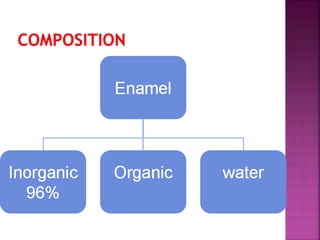 Enamel is the hardest tissue in the human body that covers the anatomical crown of a tooth. It is made up of hydroxyapatite crystals arranged in enamel rods or prisms. Enamel provides protection to the underlying dentin and allows for chewing and grinding of food. It is formed by ameloblasts, which deposit an organic matrix that mineralizes into enamel. Enamel can demineralize from acid produced by bacteria, leading to dental caries if left untreated.