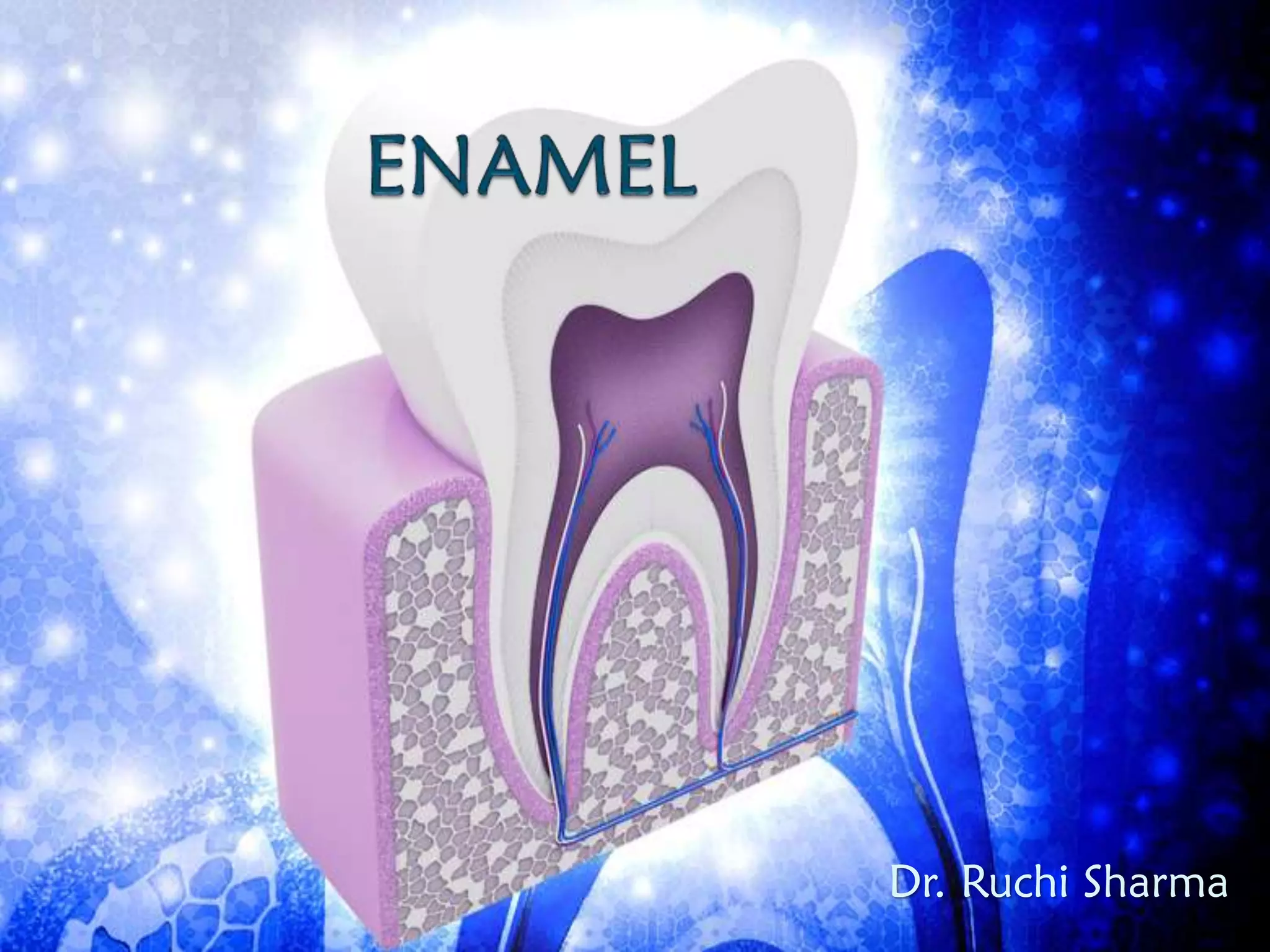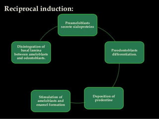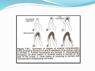 The document summarizes key aspects of enamel structure and formation. It describes that enamel is composed of elongated enamel rods made of hydroxyapatite crystals. Enamel formation (amelogenesis) involves an initial secretory stage where the enamel organic matrix is deposited, followed by a maturation stage where the matrix mineralizes. During the secretory stage, ameloblasts form finger-like projections called Tomes' processes that guide enamel rod formation.