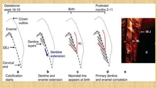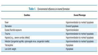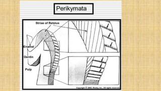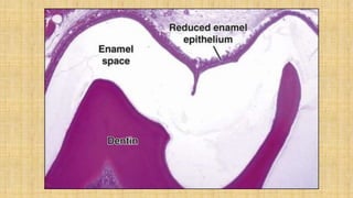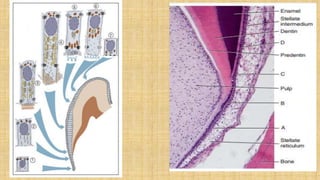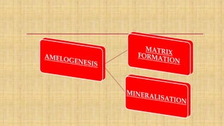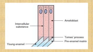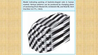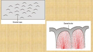 This document summarizes the structure and formation of enamel. It begins by describing enamel as the hardest substance in the body, composed primarily of hydroxyapatite crystals. It then discusses the composition, structure, and organization of enamel rods and crystals. Hunter-Schreger bands and incremental lines are described as well. The lifecycle of ameloblasts and stages of amelogenesis - morphogenic, organizing, formative, maturative, and protective - are summarized.