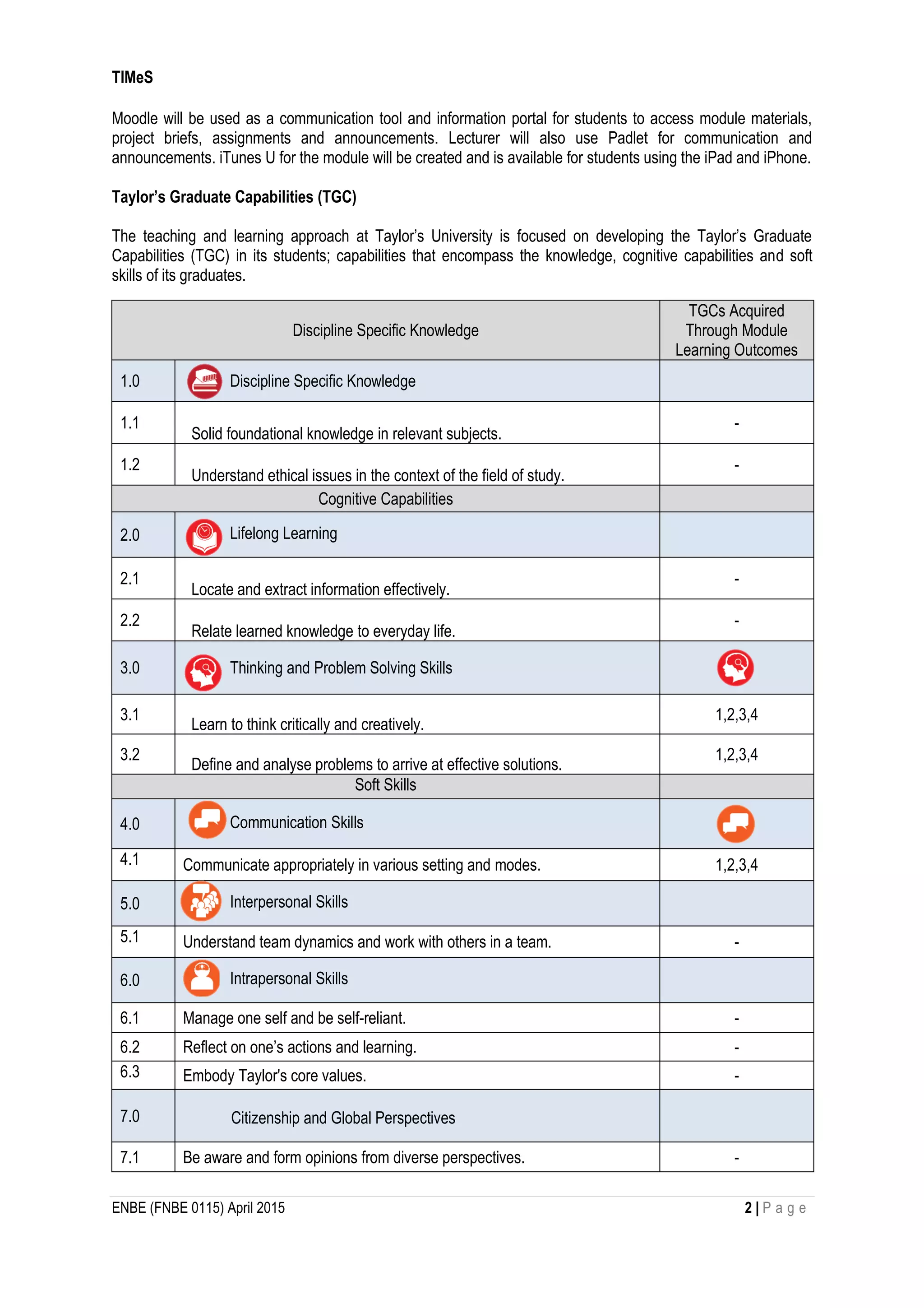 This document provides information about a module called "Element of Natural Built Environments" (ARC30105). The 5-credit module aims to expose students to natural and built environments through lectures, tutorials, site visits and projects. It will be taught over 18 weeks with 2 hours of lectures and 2 hours of tutorials per week. Students will complete 2 projects - the first on natural environments and the second on built environments. They will also maintain a journal and develop an ePortfolio. Assessment will be based on the projects, journal, and ePortfolio. The module uses student-centered learning and aims to develop students' skills in recognizing environments, describing characteristics, analyzing developments, and communicating ideas.