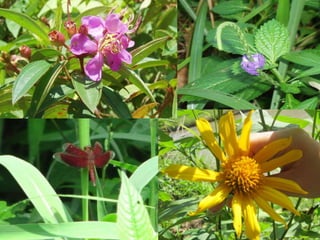 The document summarizes various elements of the natural environment, including the pine tree cricket which camouflages among pine leaves, the rubber tree which provides latex but also attracts rats, and the five human senses. It also describes stages of a journey to a site for surveying, collecting sea shells from a river, fishing by a river at night, and enjoying a relaxing view.