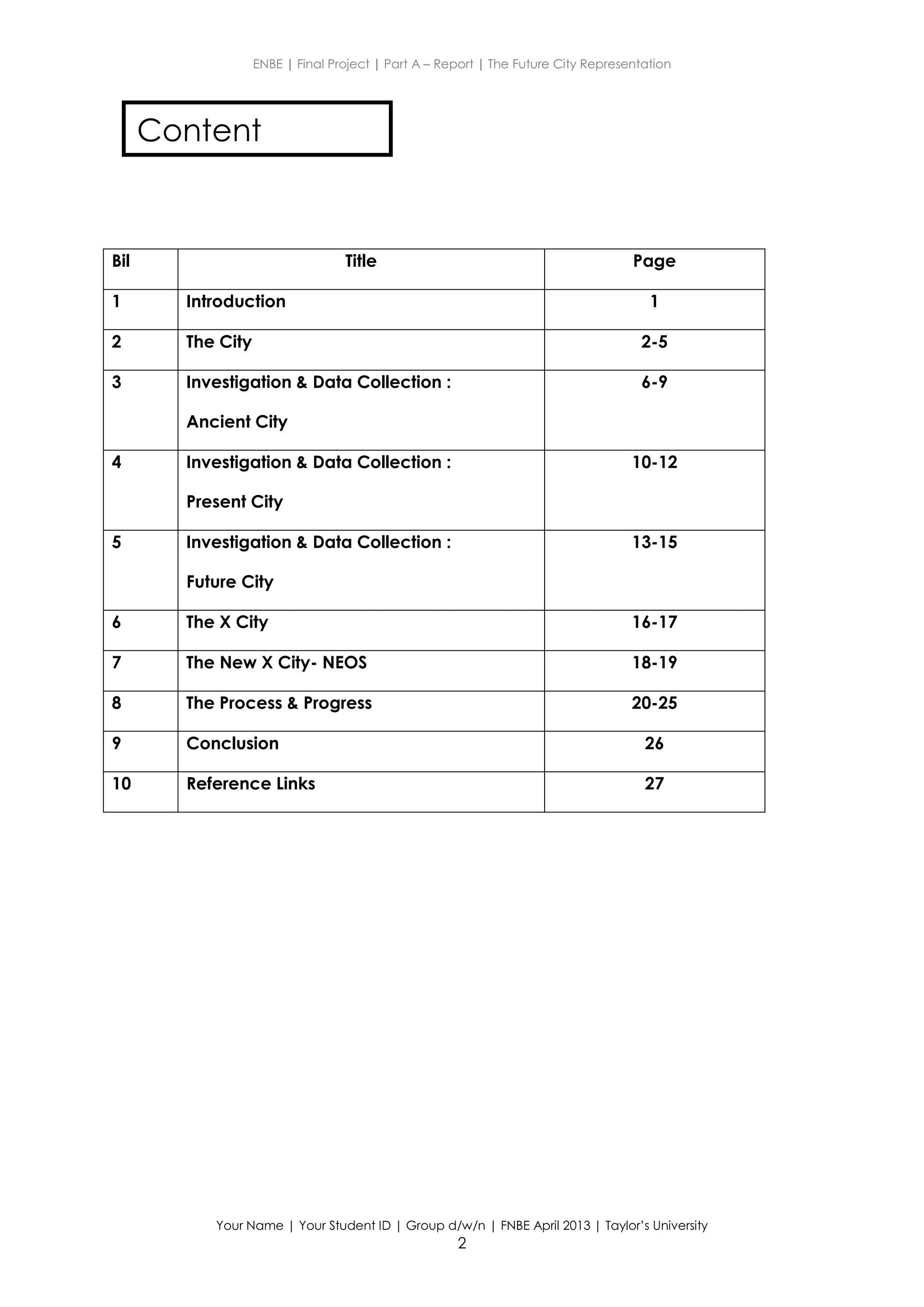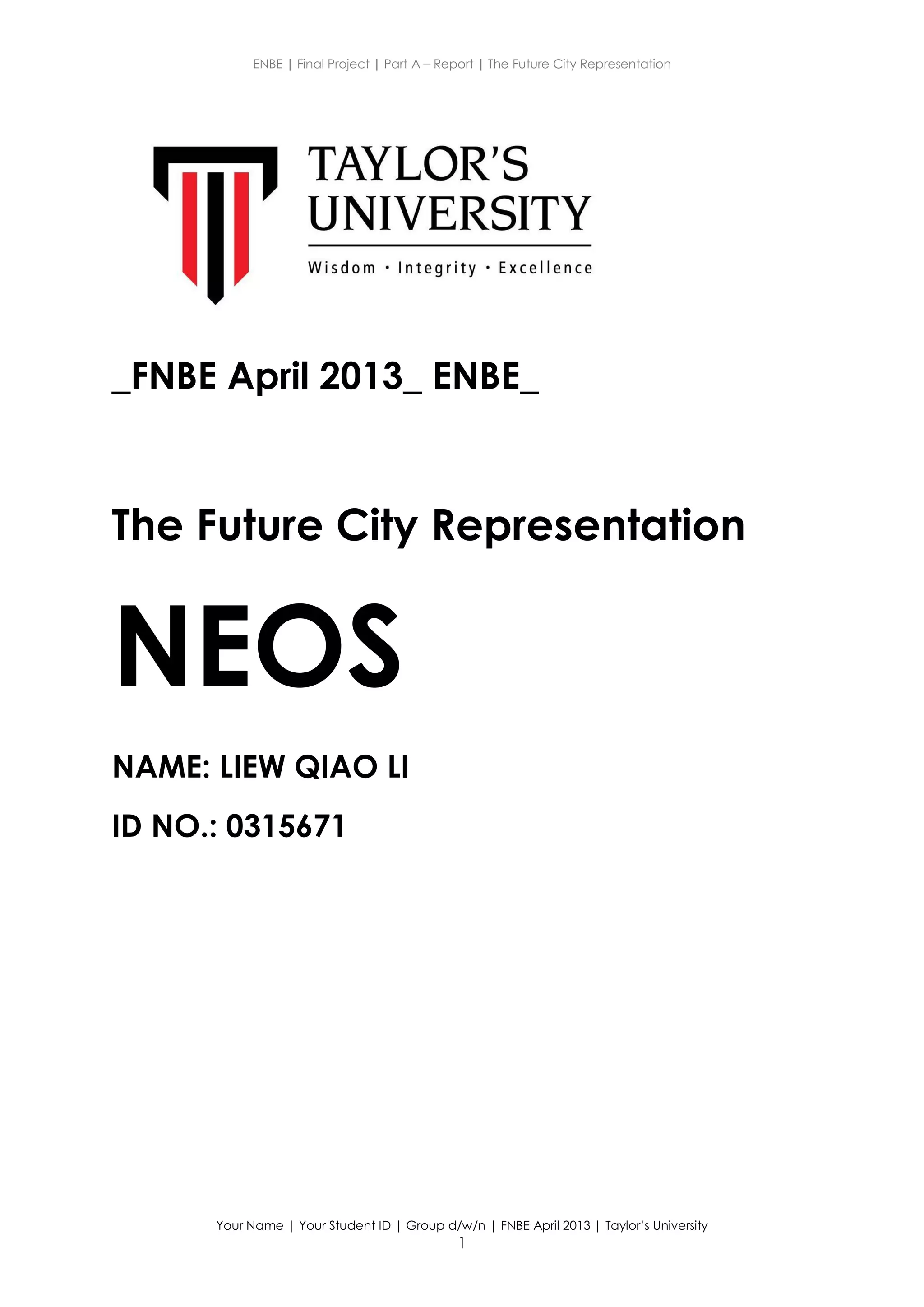This report summarizes the progress on a group project to design a future city. It includes investigations of ancient, present and future cities to gather data and ideas. The group chose to call their floating future city "NEOS", which means "new" in Greek. NEOS will be powered by renewable energy and focus on tourism, with residential and commercial areas within 20 minutes of each other. The report outlines the zoning plan and development process for NEOS.
