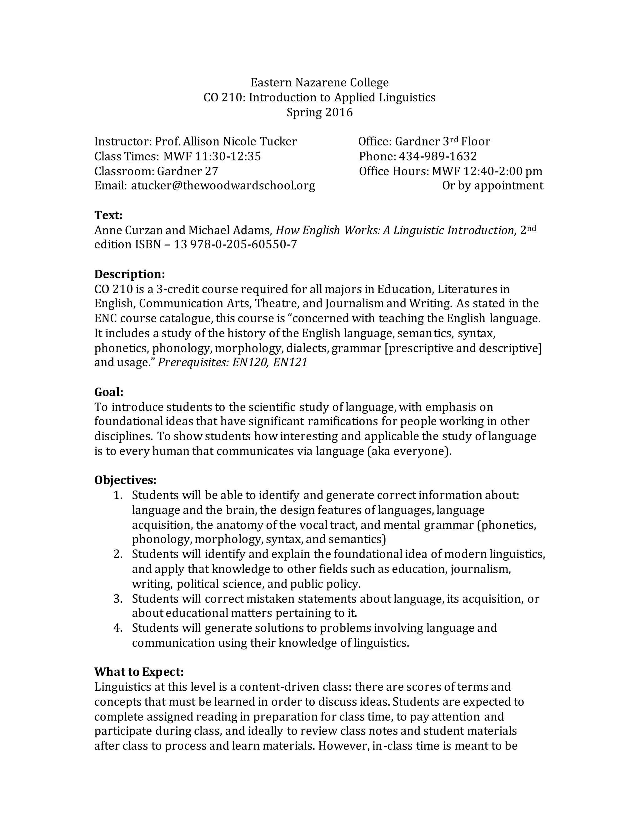 This document provides information about an introduction to applied linguistics course at Eastern Nazarene College. It outlines the course description, goals, objectives, expectations, policies, requirements and grading scale. The course is 3 credits and will introduce students to the scientific study of language through examining foundational concepts and applying linguistic knowledge to other fields like education and communication. Students will be evaluated based on class participation, exams, partner work and special topics presentations. The course will cover topics such as the design features of language, origins of language, language in the brain, phonetics, morphology and syntax.