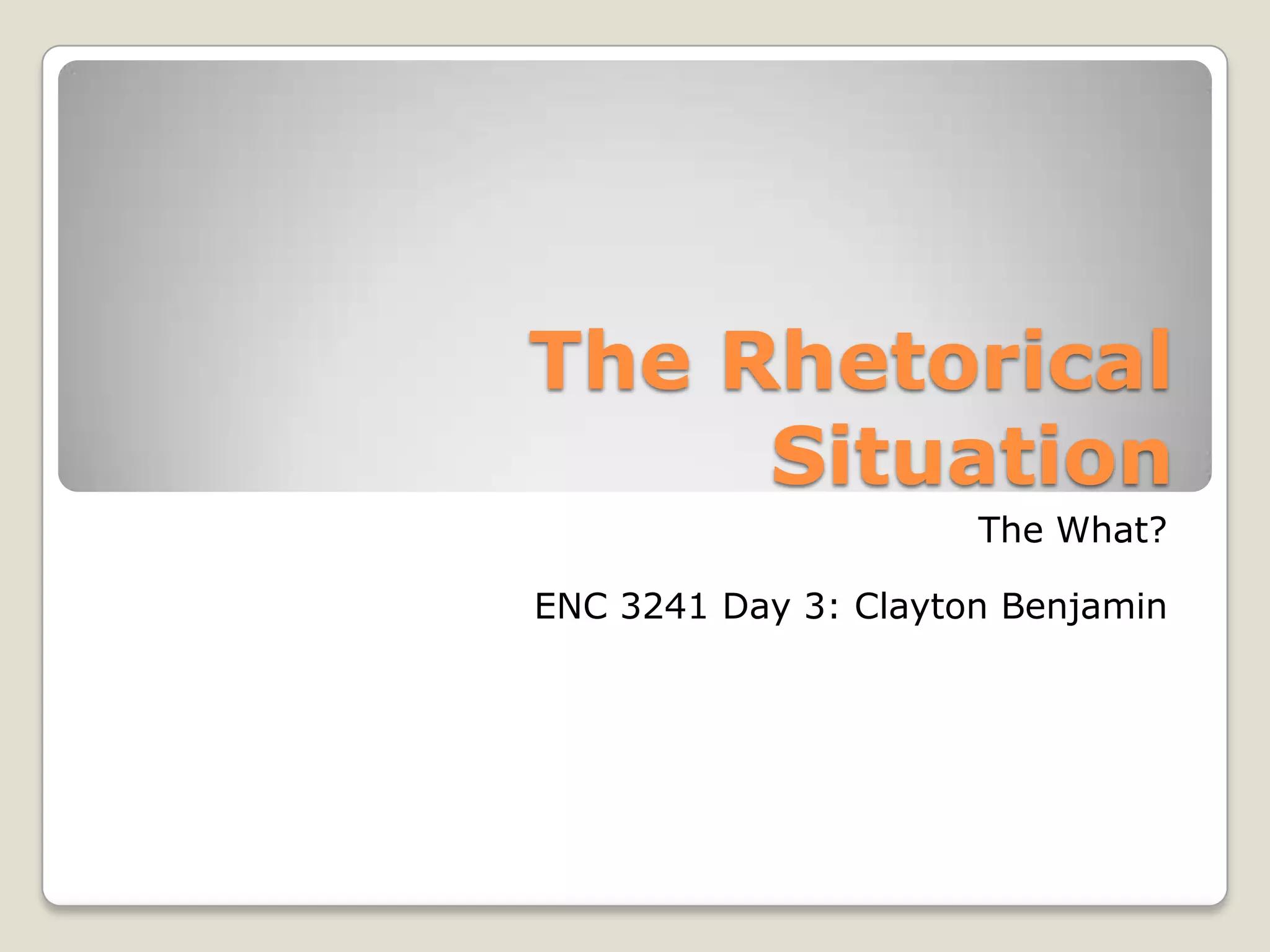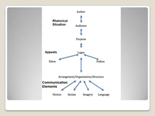 The document discusses the rhetorical situation, which has four elements: the author, the text or medium, the context, and the audience. It defines each element and provides examples. The author is the person using communication for a purpose. The text is the medium used to disseminate the message, such as a commercial, manual, or presentation. The context is the situation in which the communication occurs, including aspects like time, place, and current events. The audience refers to the people receiving the message, and can be described based on attributes like age, knowledge, and views. The document advises applying the rhetorical situation framework to technical communication by designing documents around the audience. It prompts considering questions like who the audience is and which