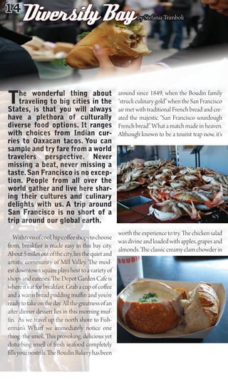 San Francisco is a culturally diverse city where you can sample food from around the world. One example is the Boudin Bakery, which has been making sourdough bread since 1849 using a traditional French technique combined with the local air. The document recommends trying the chicken salad at the touristy Boudin Bakery. It also describes enjoying breakfast at the Depot Garden Cafe in Mill Valley, which offers warm bread pudding muffins. Finally, it notes the distinctive smell of fresh seafood that hits one's nostrils upon arriving at Fisherman's Wharf.