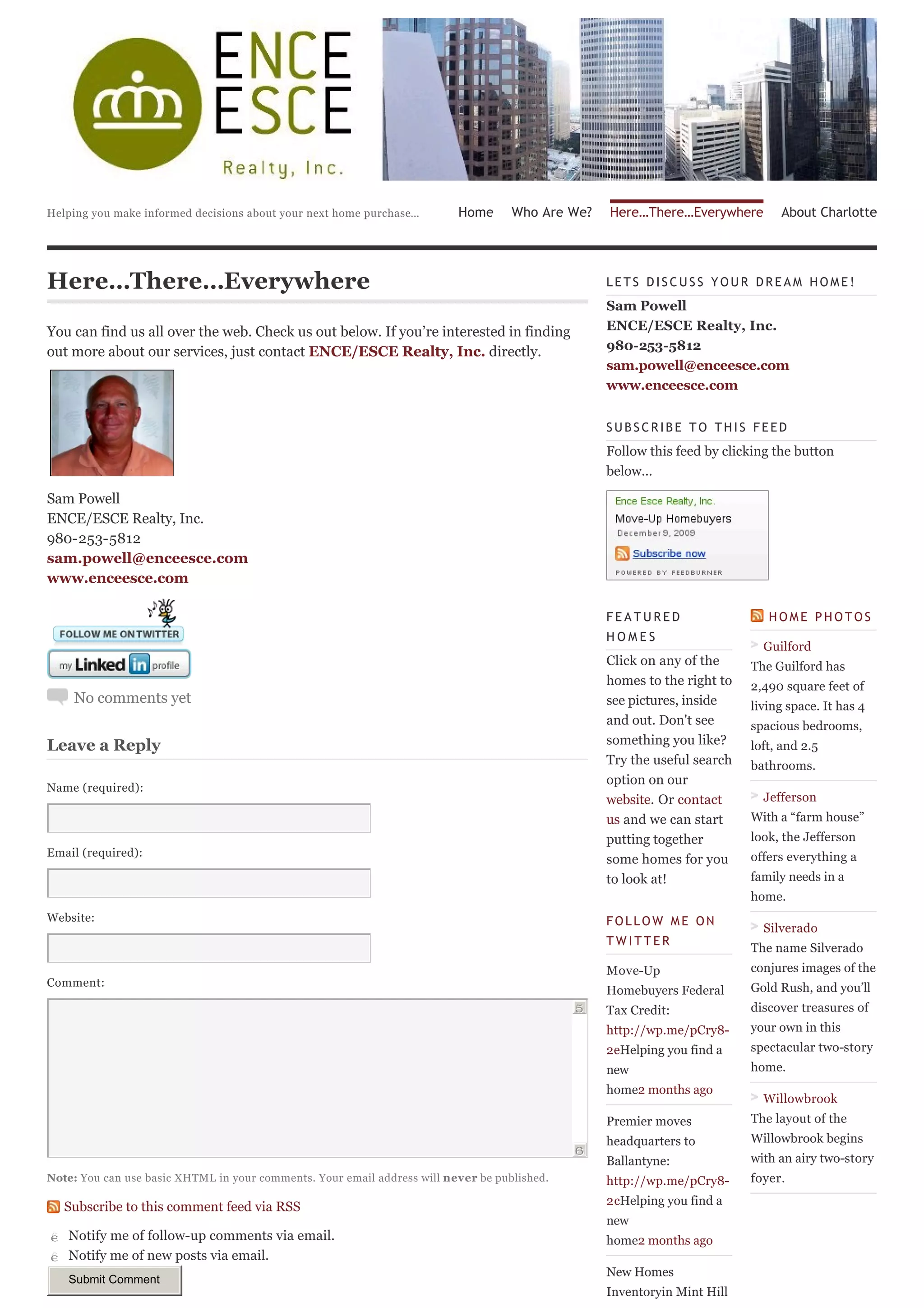 This document provides information about a real estate agent and company, ENCE/ESCE Realty, Inc. It introduces Sam Powell as an agent and gives his contact information. It also lists some featured homes for sale, provides a link to follow the agent on Twitter, and shares recent blog posts about the local housing market and available inventory.