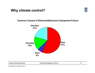 [1] Climate control products help control temperature, humidity, dust and vibration inside enclosures to improve reliability of electrical and electronic equipment.