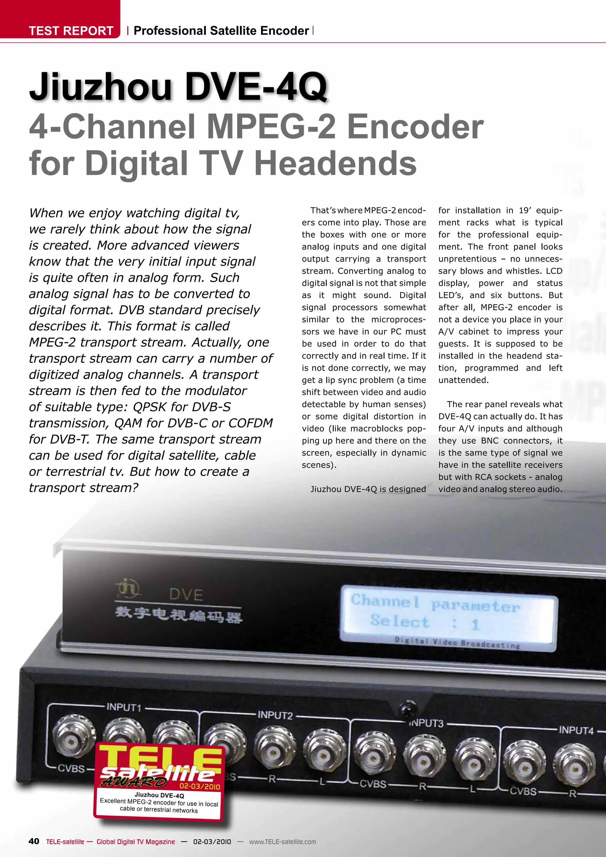 The document evaluates the Jiuzhou DVE-4Q 4-Channel MPEG-2 Encoder. It found the encoder to be a simple and flexible device that can create high quality transport streams for digital TV headends, particularly local cable or terrestrial networks supporting both PAL and NTSC standards. On testing, the encoder performed flawlessly, generating transport streams with very good quality video and audio across various resolutions and bitrates as per the user settings. The encoder is well suited for its intended use in small to medium sized networks.