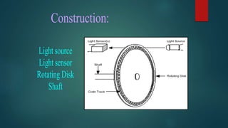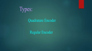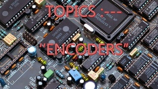 The document discusses different types of encoders. It defines an encoder as a device, circuit, transducer, software, algorithm, or person that converts information from one format to another. It provides examples of linear encoders that encode position and digital encoders that convert multiple inputs into a binary coded output. Specifically, it describes an n-bit binary encoder that has 2n inputs and n outputs, and provides truth tables for 8-to-3 and 4-to-2 bit encoders. It also discusses priority encoders that prioritize inputs and output the code of the highest priority active input.