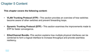 This chapter discusses VLAN trunking protocols (VTP), dynamic trunking protocol (DTP), and EtherChannel bundles. VTP allows VLAN configurations to be propagated across switches to reduce provisioning burden, while DTP dynamically establishes trunk links between switches. EtherChannel bundles multiple physical links into a single logical trunk to increase bandwidth and provide redundancy.