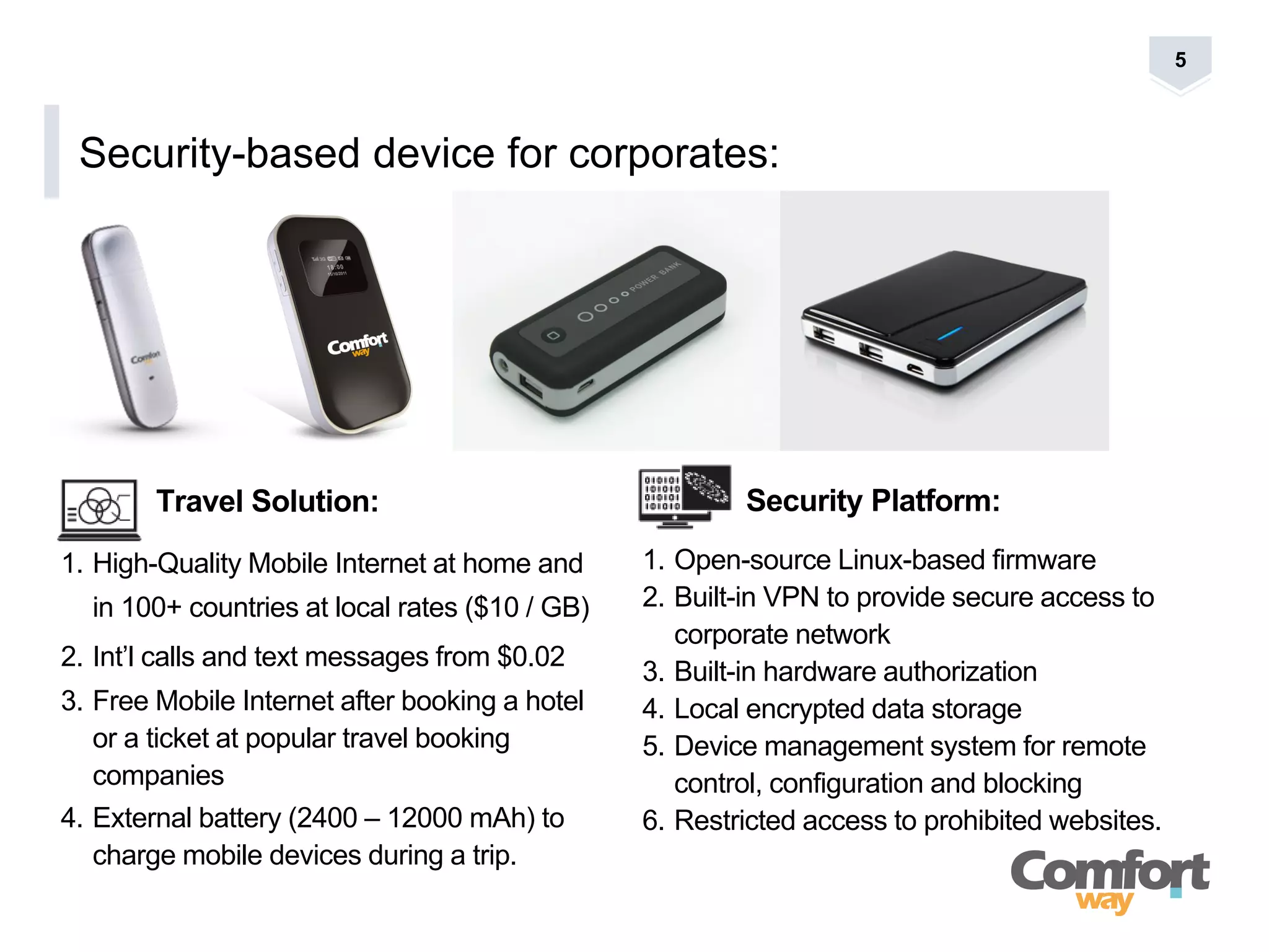 This document describes two travel-related solutions: a mobile internet and communications package for travelers that provides high-quality internet access in over 100 countries at local rates, affordable international calls and texts, and free data after booking hotels or tickets; and a security-based device for corporations that features an open-source Linux firmware, built-in VPN, hardware authorization, encrypted local storage, and remote management system to securely access corporate networks while restricting access to prohibited websites.