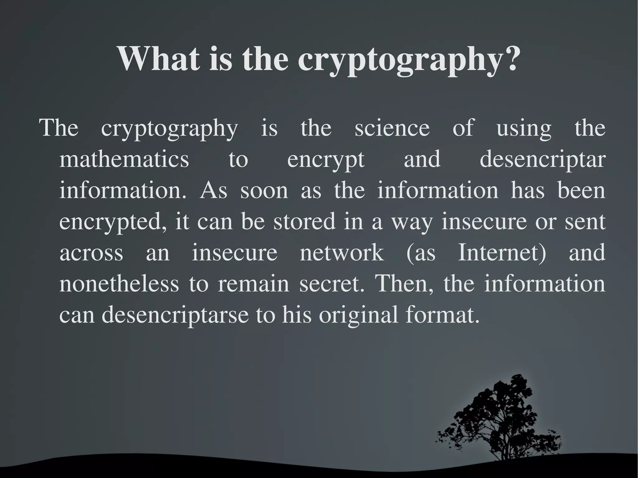 Cryptography is the science of using mathematics to encrypt and decrypt information. The encryption process translates information into an encrypted format that seems random and has no meaning. Decryption translates the encrypted information back into its original format. A cryptographic algorithm is a mathematical function used for encryption and decryption that combines the information with a key. Symmetric algorithms encrypt and decrypt with the same key, providing fast and secure encryption, while asymmetric algorithms use different public and private keys, allowing information to be encrypted with a public key and decrypted with a private key.