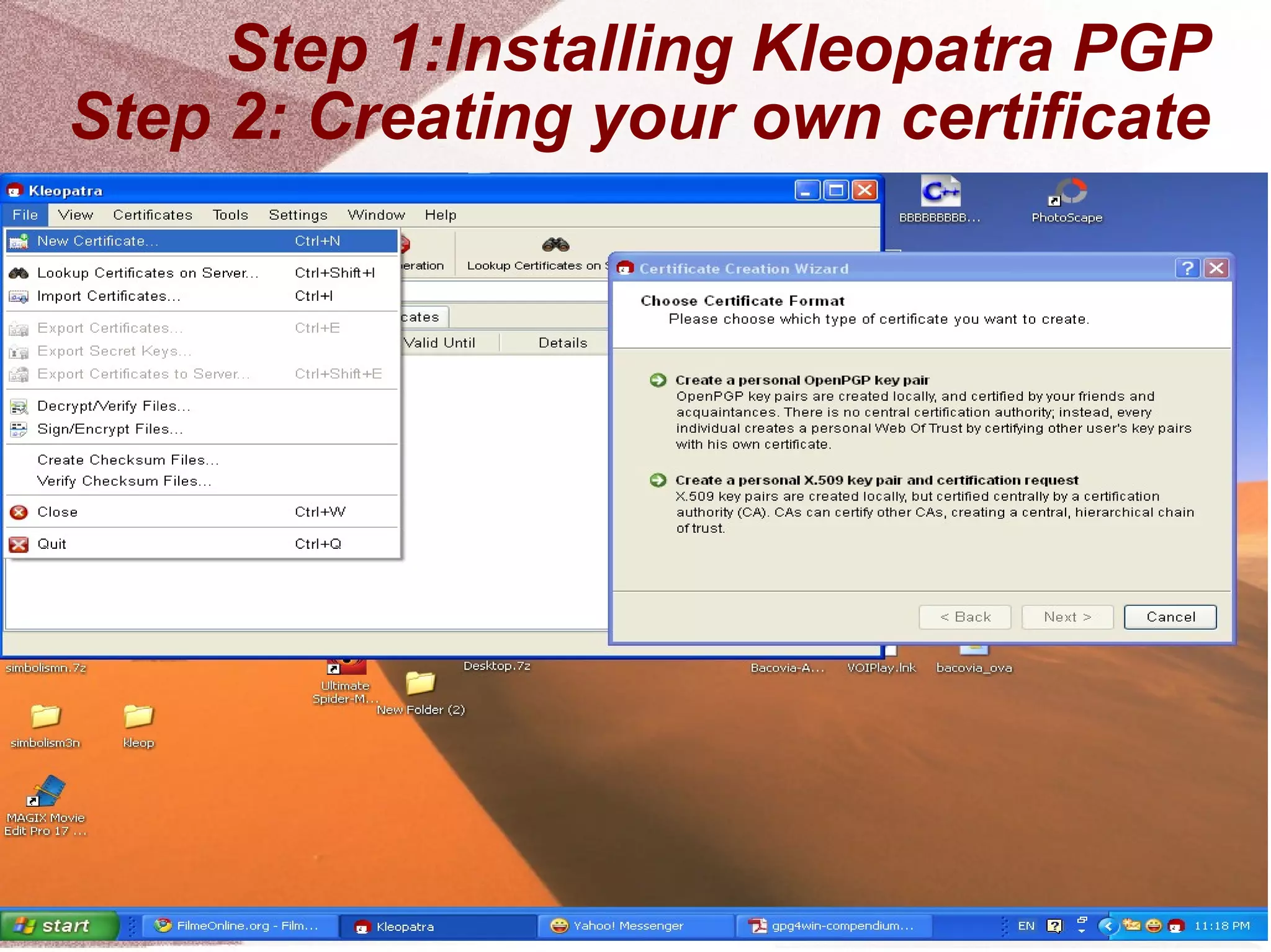 The document outlines a step-by-step guide for encrypting emails using Kleopatra PGP. It includes instructions on installing Kleopatra, creating a certificate, exporting and importing keys, and attaching them to emails for secure communication. The guide is prepared by students at Colegiul Național 'G.H. Roșca Codreanu' under the coordination of their professor.