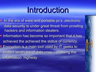 The document discusses encryption technology and its importance for securing electronic data. It describes how encryption works using encryption keys to scramble plaintext into ciphertext. Symmetric key algorithms like DES and asymmetric key algorithms like RSA are explained. The document also covers digital signatures, latest encryption methods like virtual matrix encryption, and quantum cryptography. It concludes that encryption technology is an emerging field with better, more secure algorithms being developed to transfer information securely over networks.