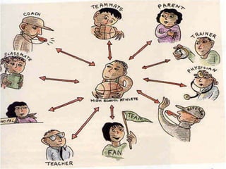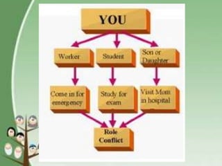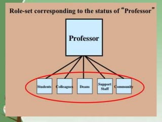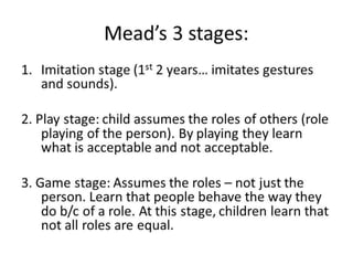 The document discusses key concepts related to socialization and identity formation. It describes enculturation as the process of learning the values and behaviors of one's culture. Socialization aims to teach impulse control, prepare individuals for social roles, and cultivate shared meanings. George Herbert Mead contributed the idea of the "self" developing through interaction with others and assuming their perspectives. He described stages from imitation to role-taking to developing a "generalized other." Norms guide behavior through socialization while status and roles shape expectations and identity.