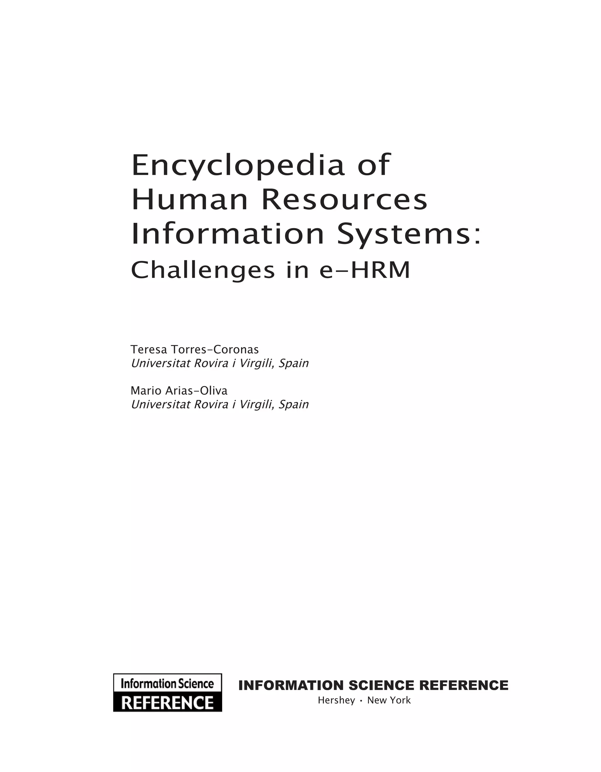 This document provides an introduction to the Encyclopedia of Human Resources Information Systems: Challenges in e-HRM. It is edited by Teresa Torres-Coronas and Mario Arias-Oliva and published by IGI Global. The encyclopedia rigorously analyzes key critical HR variables and defines previously undiscovered issues in the HR field. It contains contributions from over 150 authors from around the world on topics related to personnel management, information storage and retrieval systems, management information systems, and the management of knowledge workers.