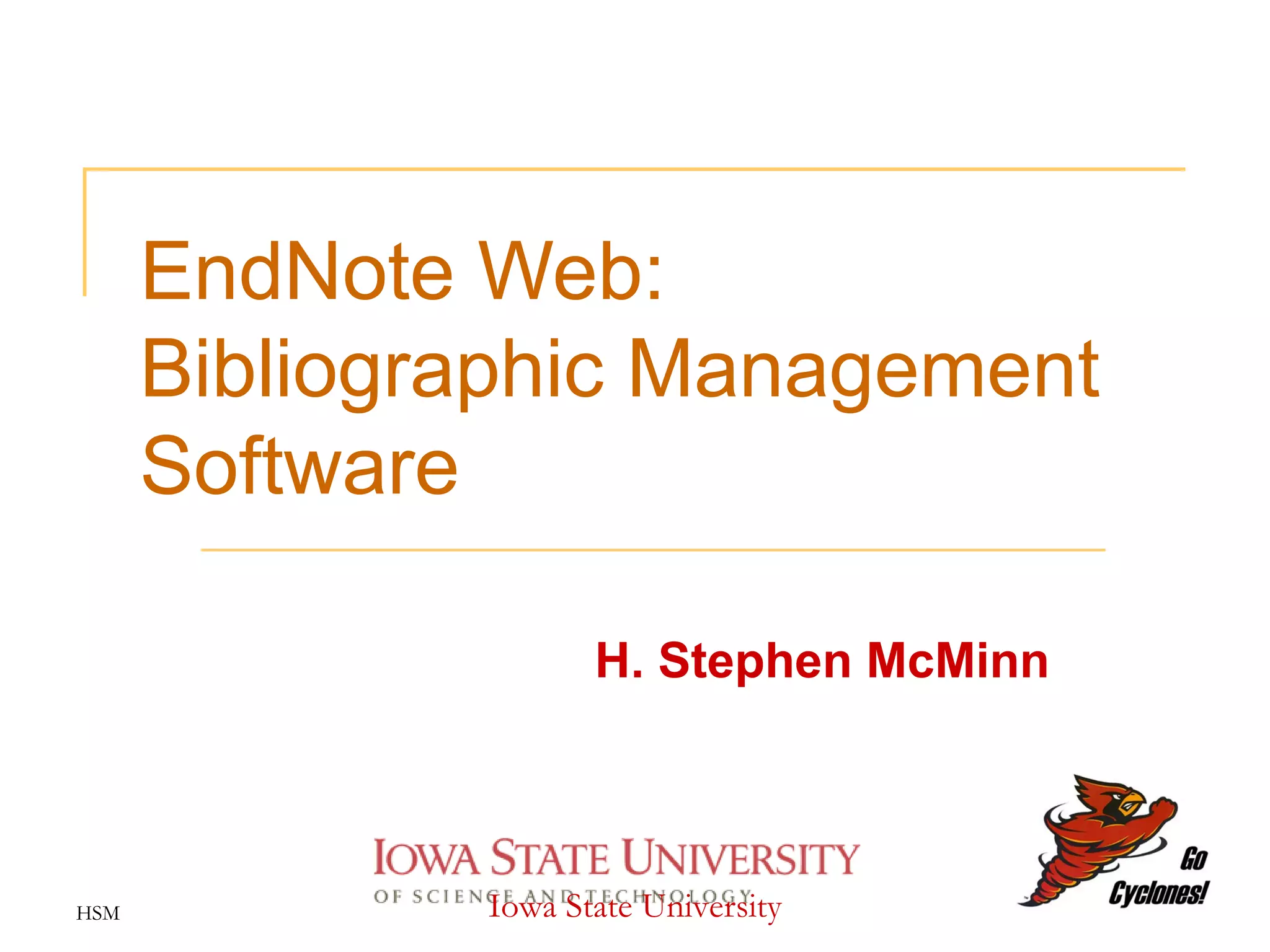 The document provides an overview of EndNote Web, a bibliographic management software. It discusses how EndNote Web can be used to organize references, insert citations in Word documents, and automatically generate bibliographies. The presentation then demonstrates how to set up an EndNote Web account, import references from databases, insert citations into a Word document, and format the bibliography. It concludes by providing help resources and announcing an upcoming workshop on the similar tool Zotero.