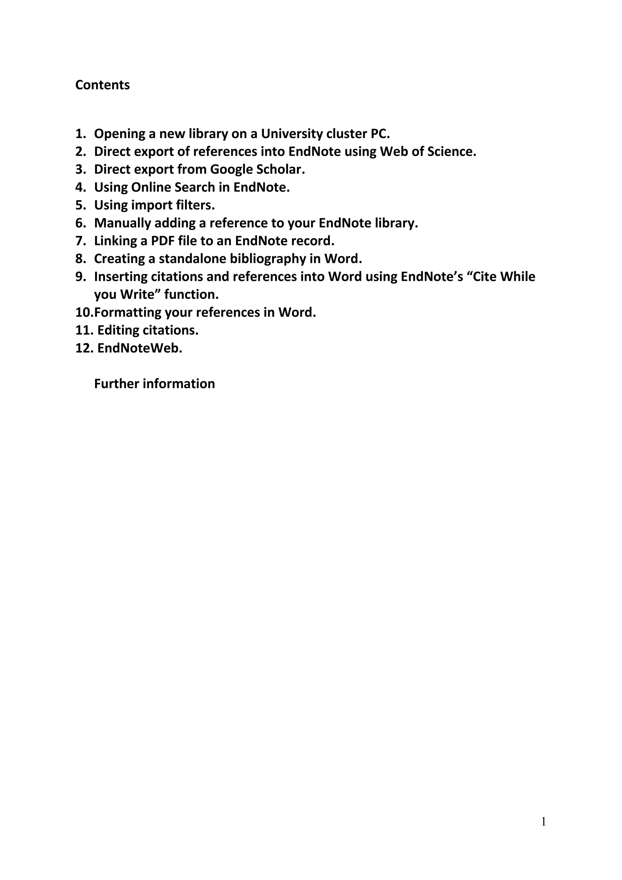 This document provides an overview of how to use EndNote x3 software to manage references and citations. It covers topics such as opening a new EndNote library, directly exporting references from databases like Web of Science and Google Scholar, manually adding references, linking PDF files to records, creating stand-alone bibliographies in Word, and inserting citations into Word documents using EndNote's "Cite While You Write" function. The document is intended to serve as a starting guide for using EndNote's various features.