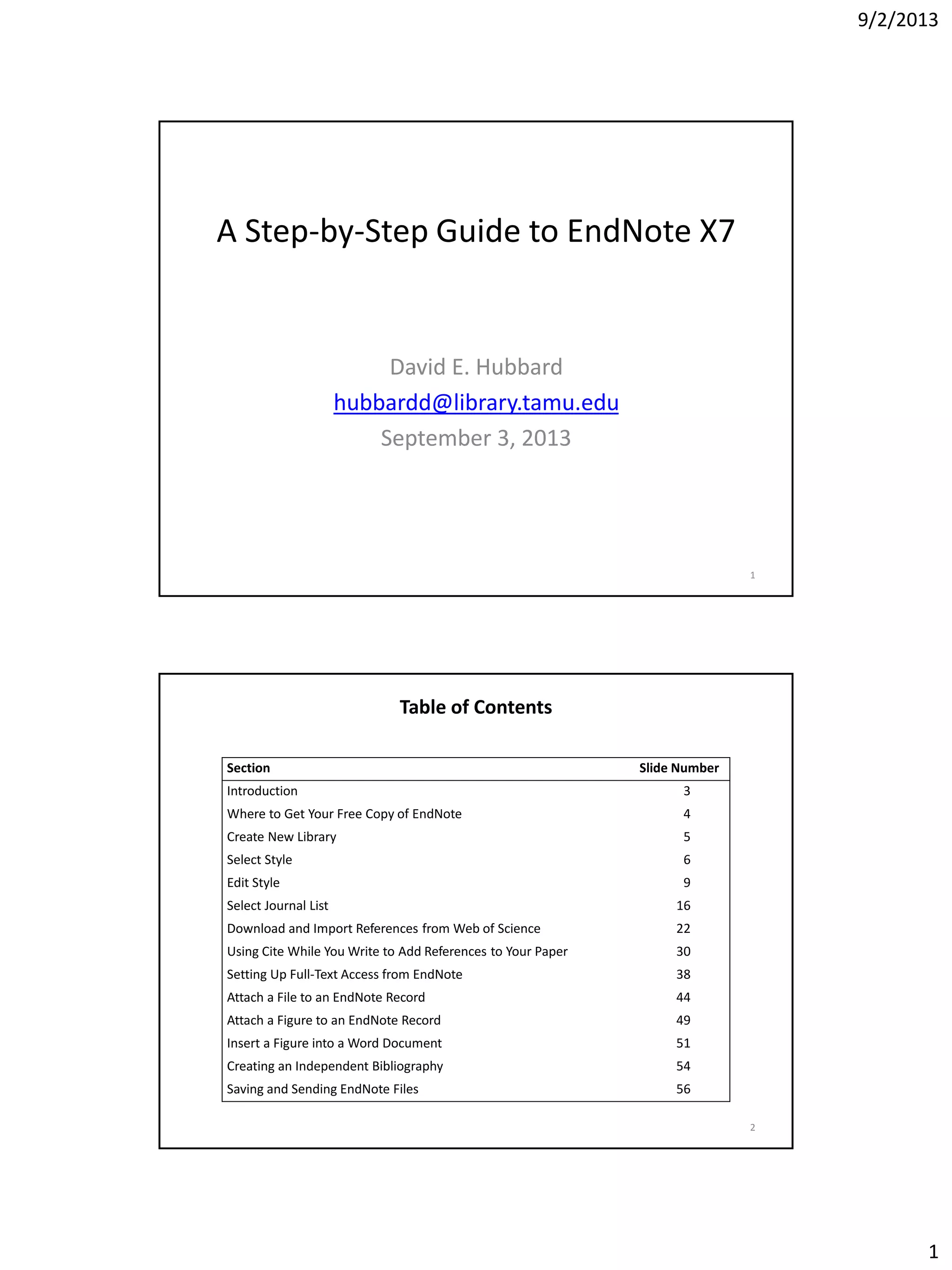 This document provides a step-by-step guide to using EndNote X7 software. It outlines how to create and manage an EndNote library, select bibliographic styles, import references from databases like Web of Science, insert citations into a Word document, and attach files and figures to EndNote records. The guide is intended to introduce basic EndNote features and functions.